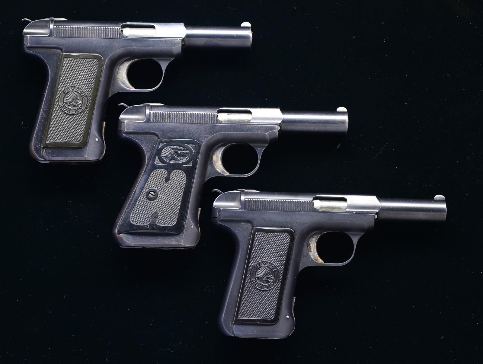 1) M1907. Cal. 7.65mm (32 ACP). S# 223073. Bbl. 3 3/4". Blued finish. Fixed sights. Spur hammer. Manual frame safety. Push button heel mag release. Black Savage gutta percha grips. Case colored trigger & mag release. MAGS: 1 - 7 rd. CONDITION: overall very high condition example w/ strong original blue & case coloring. Showing faint muzzle wear & scattered light handling marks. Very nice grips w/ a few light handling marks. Near excellent bight shiny bore w/ sharp rifling. (20-3834/ZAL). 2) M1907. Cal. 7.65mm (32 ACP). S# 229313. Bbl. 3 3/4". Blued finish. Fixed sights. Spur hammer. Manual frame safety. Push button heel mag release. Black Savage gutta percha grips. Case colored trigger & mag release. MAGS: 1 - 7 rd. CONDITION: overall a nice example w/ some light muzzle & high edge wear. Scattered handling marks. Good grips have some light areas of wear & minor handling marks. Thinning case coloring. Frosted bore w/ worn rifling. (20-3838/ZAL). 3) M1917. Cal. 7.65mm (32 ACP). S# 243273. Bbl. 3 3/4". Blued finish. Fixed sights. Spur trigger. Manual frame safety. Push button heel mag release. Black Savage gutta percha grips. Case colored trigger & mag release. Most noticeable difference between the M1907 & M1917 is the larger sized grip on the 1917. MAGS: 1 - 7 rd. CONDITION: overall good plus w/ some high edge & muzzle holster wear. Cleaned pitting on the left forward area of the slide. Strong bluing w/ scattered handling marks & spots of minor oxidation. Nice case coloring on trigger w/ fading colors on the mag release. Bore shows pitting w/ dark appearance. (20-3843/ZAL). ALL CURIO. $900-1,400.