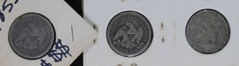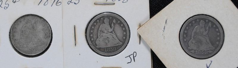 3 SEATED LIBERTY QUARTERS 1853 F, 1858 VG, 1876 G