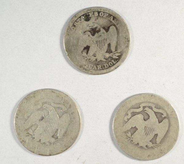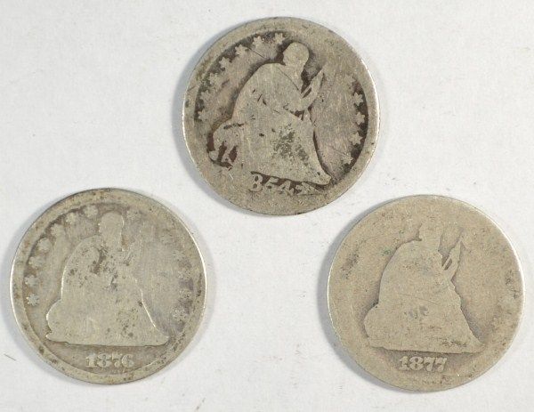 3 SEATED LIBERTY QUARTERS 1876, 77, 54. ALL LOW GRADE BUT WITH READABLE DATES