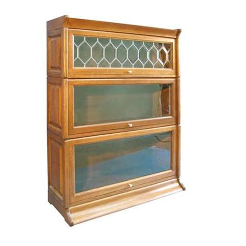 Three section stacking bookcase 595.00 + 155.00 s&h CC# BY NOON SHIP SAME DAY TRANSIT 3-5 DAYS Three section oak, no veneer,Bevel glass doors with top section having leaded bevel glass door. no tools required. can ship UPS. Rail and style joinery used just like the joinery used on the bookcases made at the turn of the century in 1900.new reproduction.