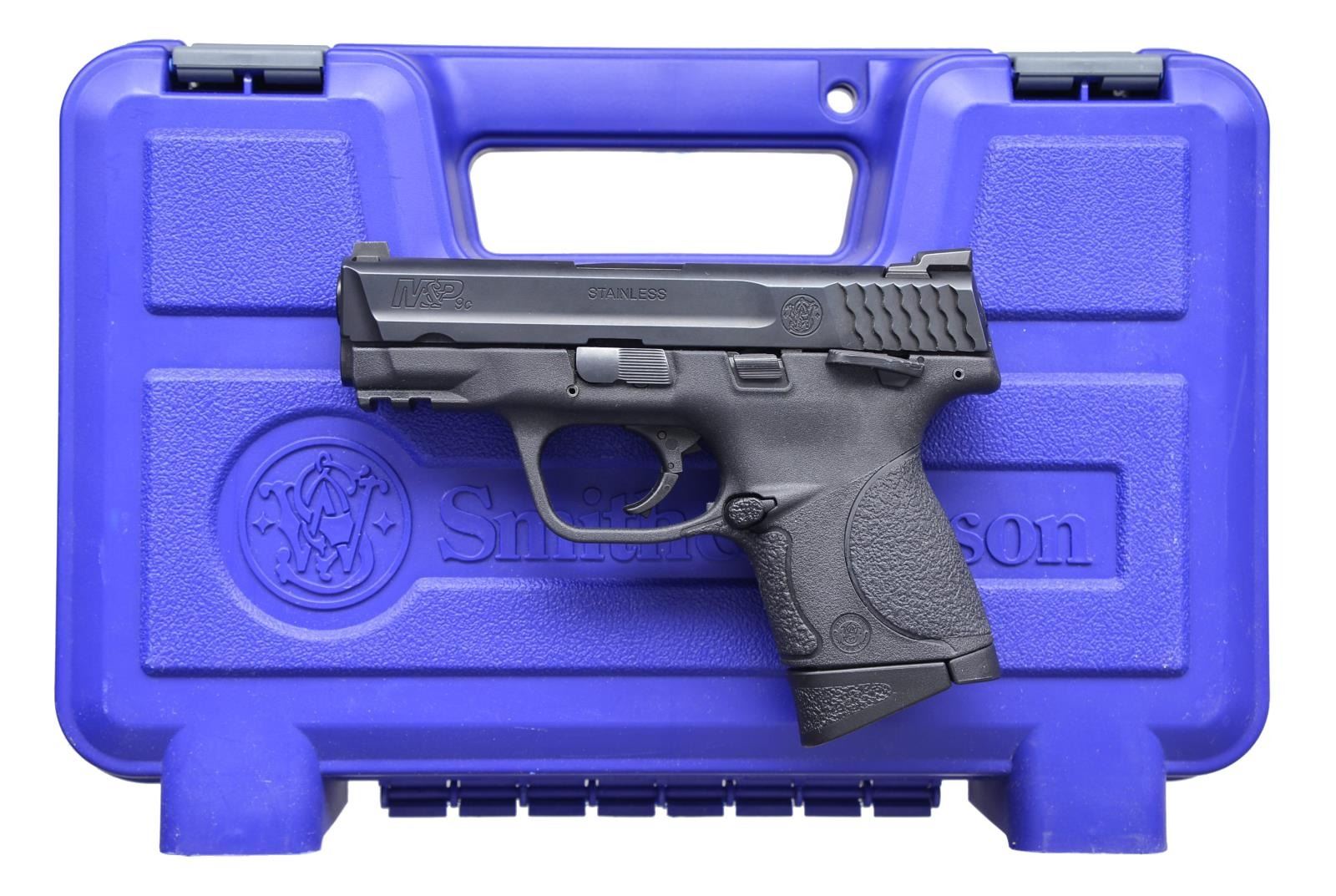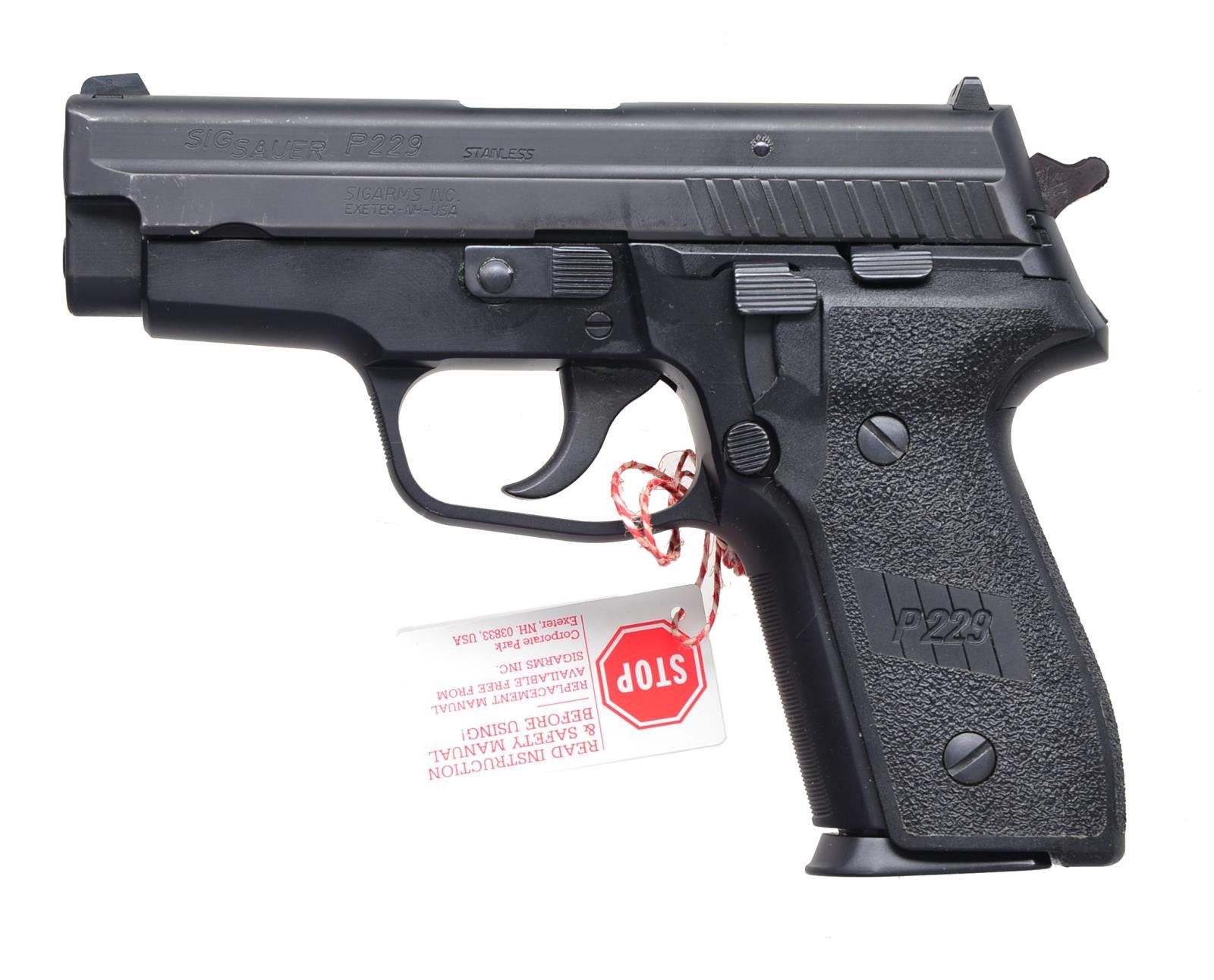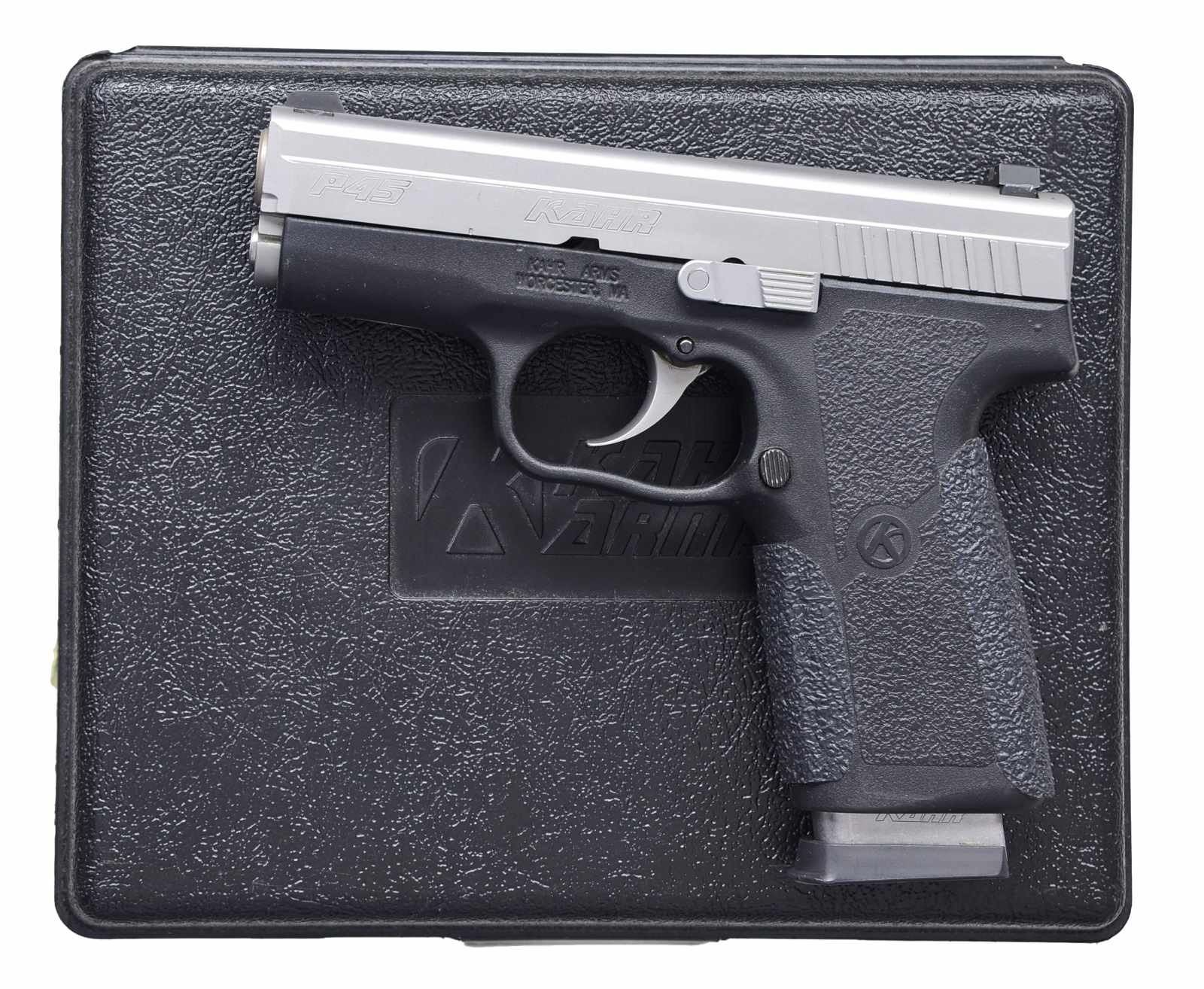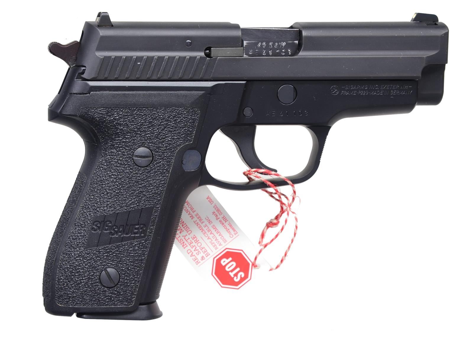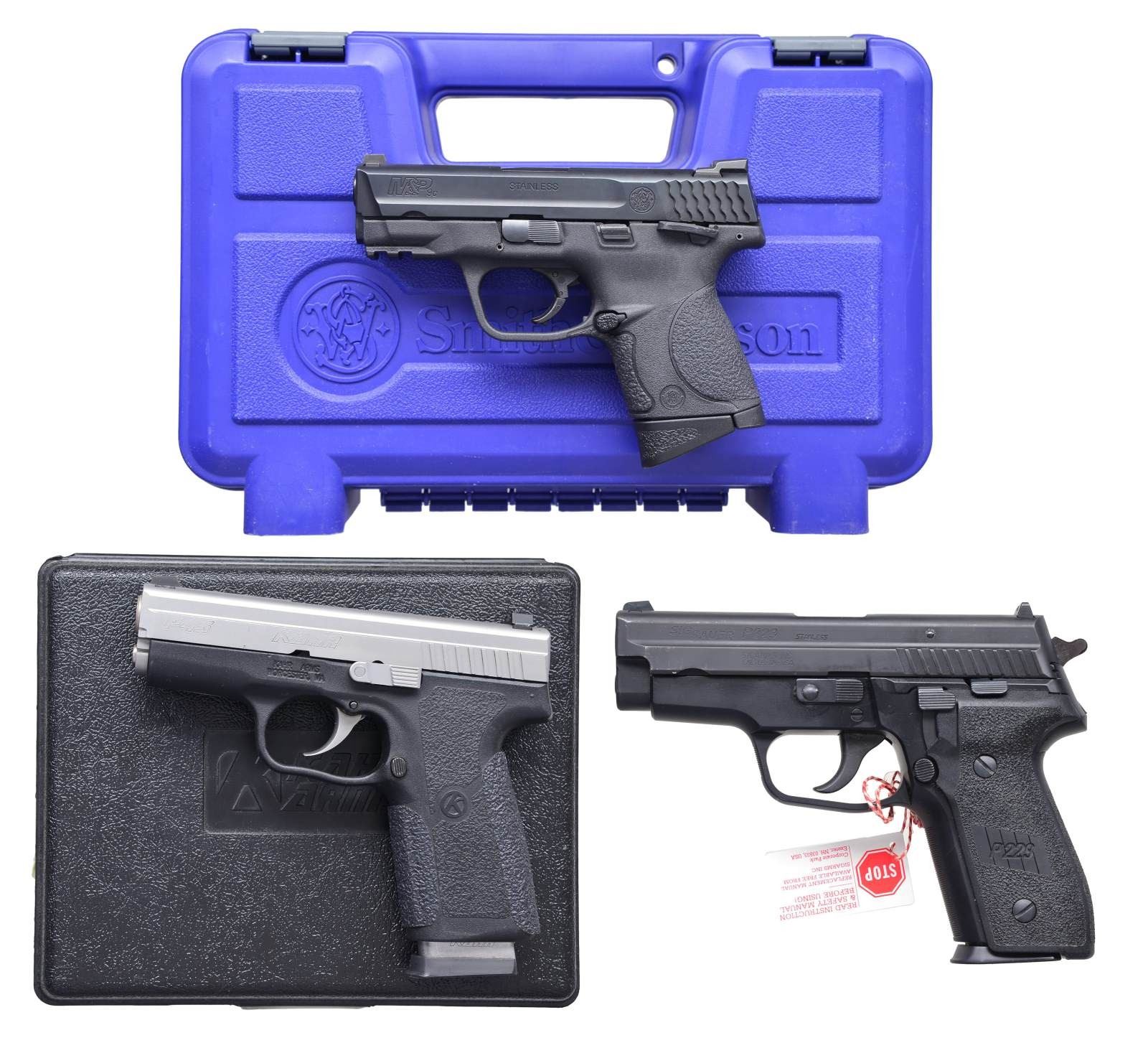 1) S& W M& P 9C. Cal. 9mm Para. S# DVX0269. Bbl. 3 1/2". Blued stainless slide. 3 Dot low profile sights. Polymer frame w/ ambidextrous safety. Trigger safety. MAGS: 2-11 rd. UNATTACHED ACCESSORIES: blue plastic S& W box w/ matching label containing paperwork. CONDITION: overall near excellent. Near excellent bore w/ great rifling. (20-3911/ZAL). 2) SIG SAUER P229. Cal. 40 S& W. S# AE41103. Bbl. 3 3/4". DA w/ decocking lever. Nitron finish. Fixed sights. 2 Piece stippled black plastic grips. MAGS: 1-10 rd. CONDITION: overall very good plus w/ only a light amount of high edge wear in slide towards muzzle. Near excellent bore. (20-3912/ZAL). 3) KAHR ARMS P45. Cal. 45 ACP. S# SA5834. Bbl. 3 1/2". Stainless slide. Trijicon 3 dot night sights. Polymer frame. MAGS: 2-7 rd. UNATTACHED ACCESSORIES: original box & paperwork. CONDITION: overall near excellent. Near excellent bore. (20-3934/ZAL). ALL MODERN. $800-1,200.