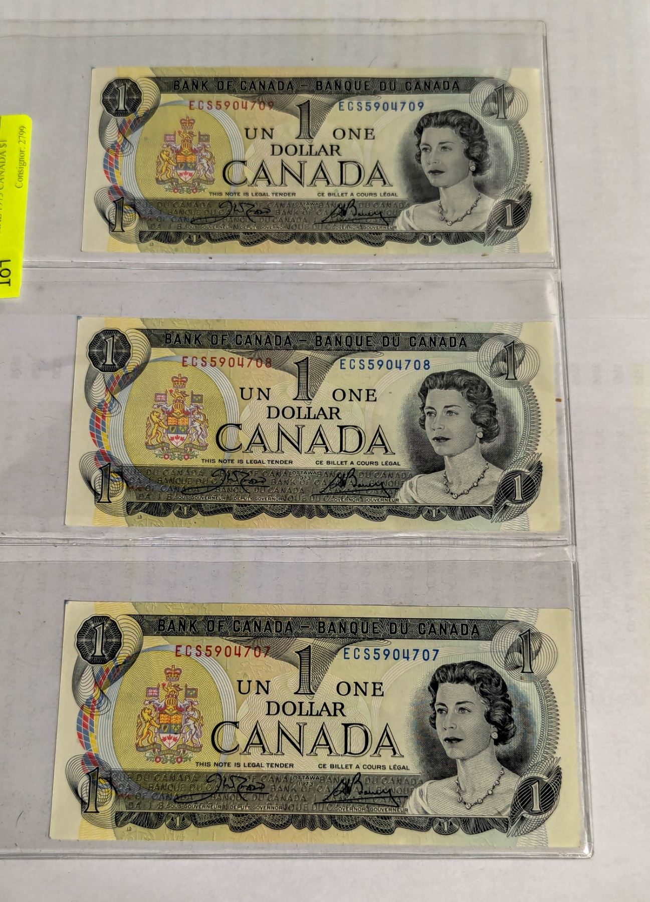 3 SEQUENTIAL 1973 CANADA $1 BILLS