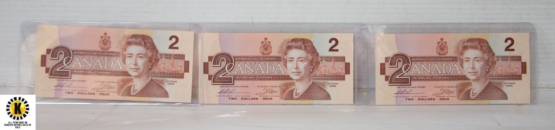 3 SEQUENTIAL 1986 CANADA 2 DOLLAR BILLS