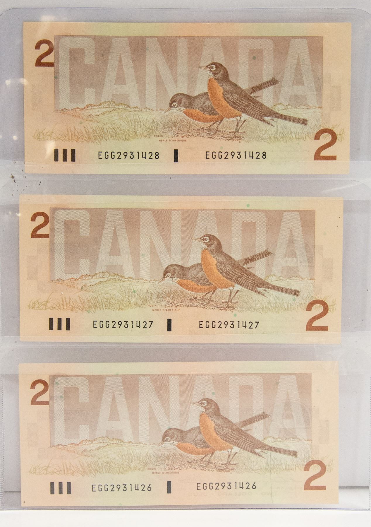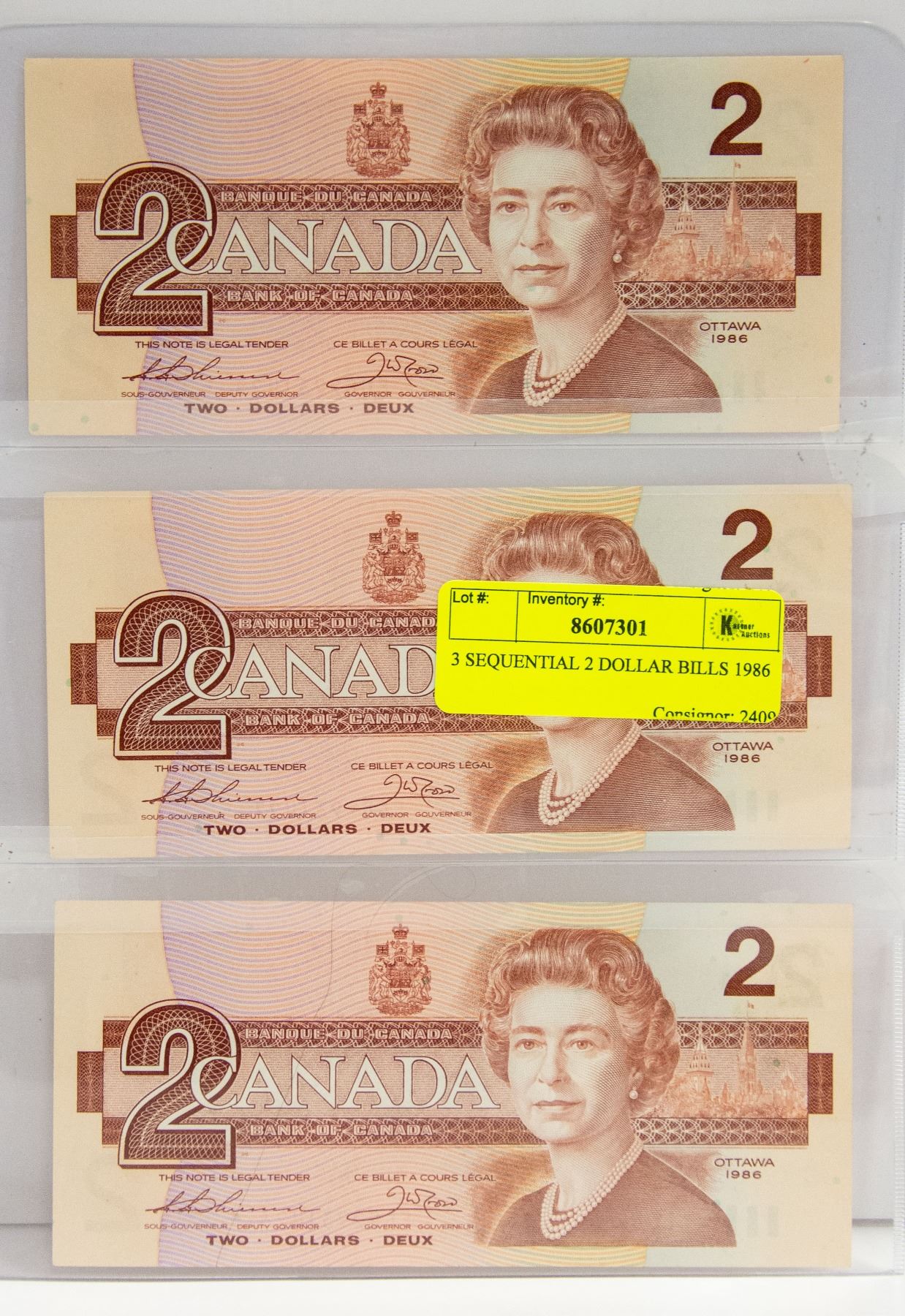 3 SEQUENTIAL UNCIRCULATED 2 DOLLAR BILLS 1986