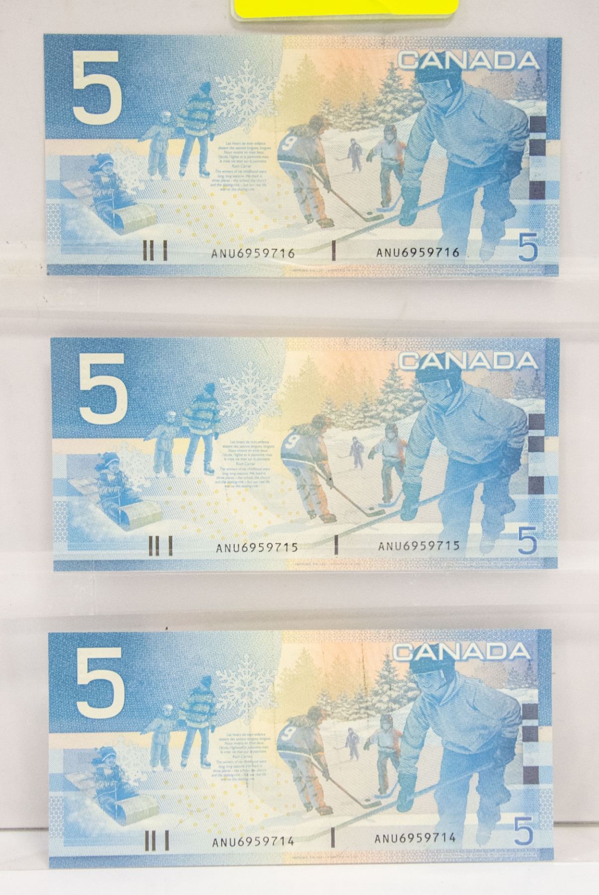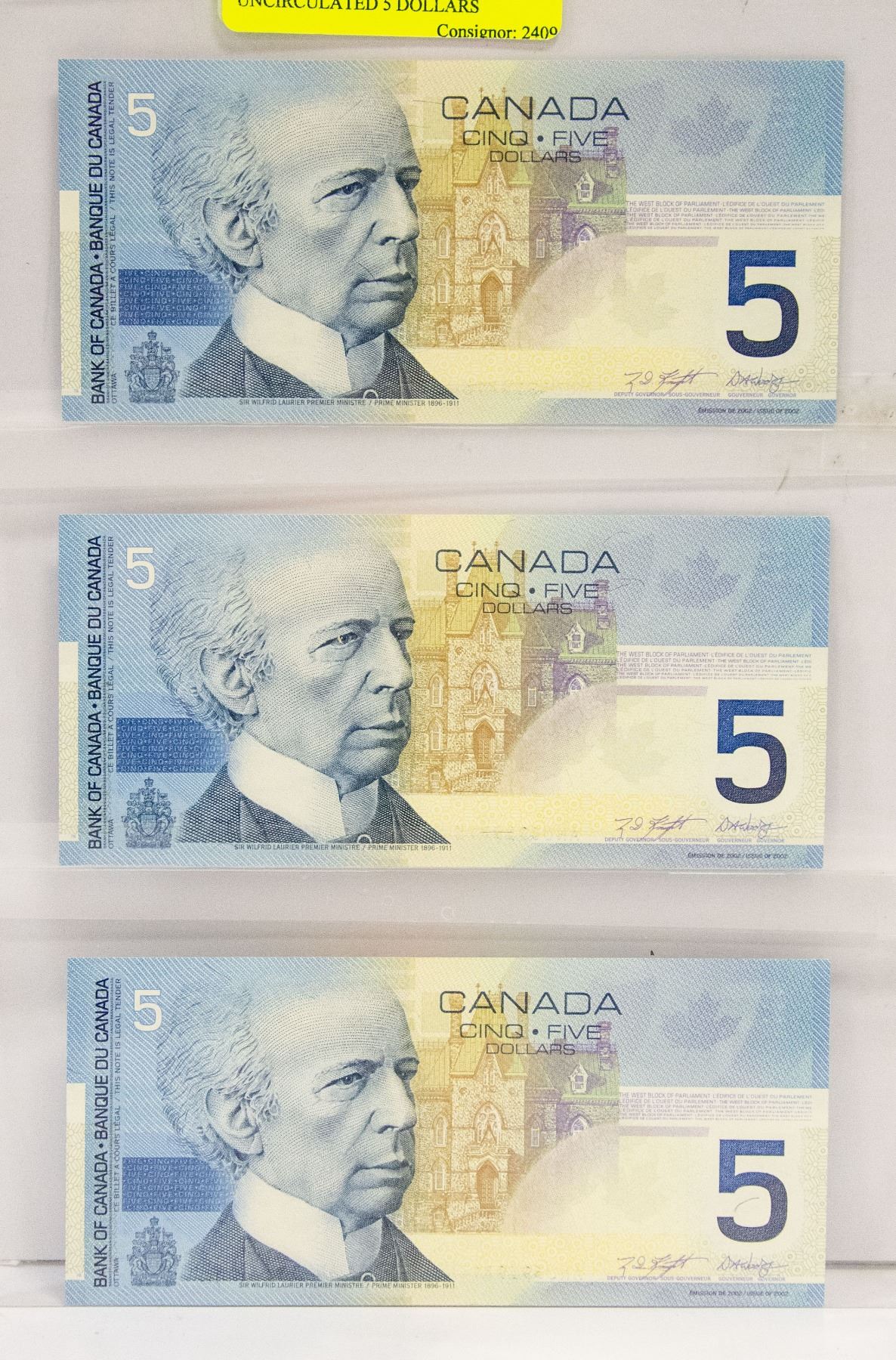 3 SEQUENTIAL UNCIRCULATED CANADIAN $5 BILLS