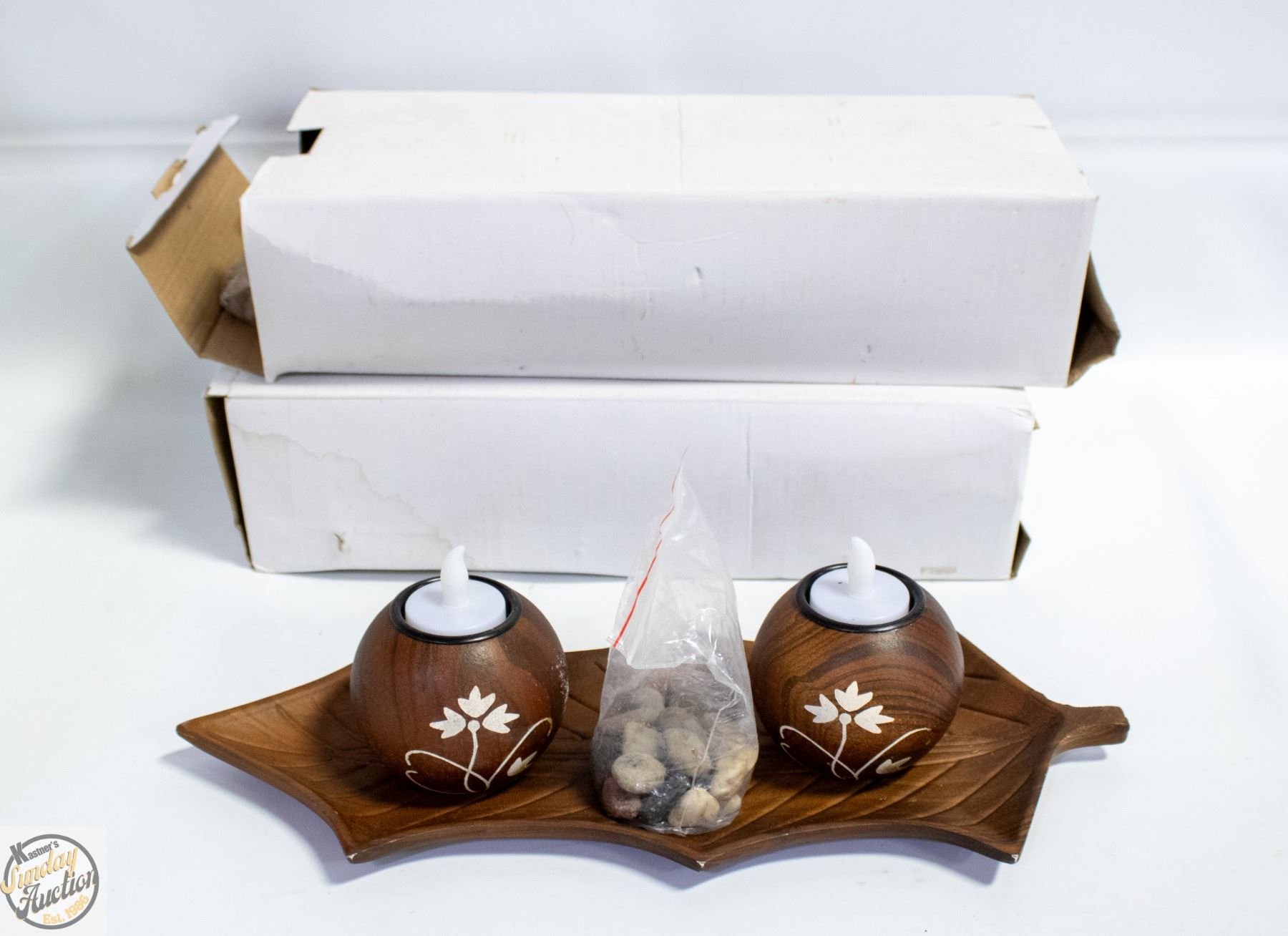 3 SETS OF TRAY, CANDLES, ROCKS