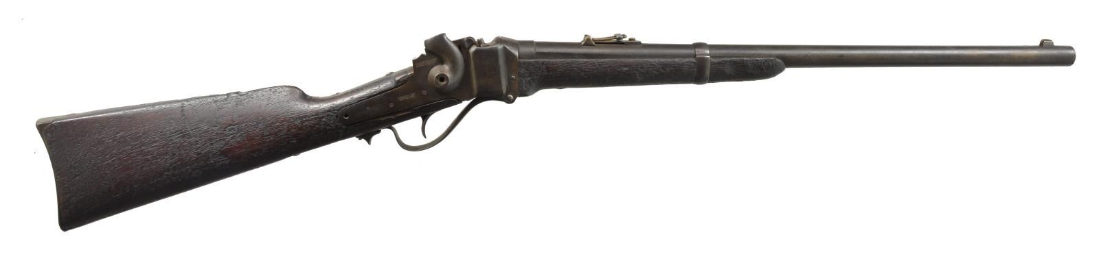 ALL: bbls. 22" w/ blade front sight & Lawrence patent rear sight. Actions have Lawrence primer feeds on lock plates & saddle bars on left side. Band fastened carbine forearms & straight grip walnut stocks w/ steel carbine buttplates. 1) Cal. 52. S# C23767. Stock has patch box on right side. CONDITION: bbl. & lock have dark patina appearance showing pitting. Action has faded gray brown appearance showing spots of light pitting. Rear sight has bent staff. Wood has dark weathered appearance showing numerous cracks, dents, chips & handling marks. Dark pitted bore. 2) Cal. 52. S# C44272. Rear sight has bent staff. Action has saddle ring & bar on left side. CONDITION: metal has dark patina appearance w/ areas of light pitting. Wood has dark heavily weathered appearance w/ cracks, lg. chips, dents & handling marks. Dark pitted bore. Hammer is broken. Hammer screw & rear lock screw are missing. 3) CARTRIDGE CONVERSION. Cal. 45-70. S# 82522. Action has saddle ring & bar on left side. CONDITION: metal has dark patina appearance w/ areas of pitting & corrosion. Wood has dark heavily weathered appearance. Stock shows wood erosion w/ dents, cracks & handling marks. Forearm has lg. chips along both sides of bbl. Breech block & breech block pin along w/ parts of the primer mechanism are missing. Bore retains sound rifling showing sm. spots of pitting. (01-18269 (3) /DS). ALL ANTIQUE. $1,000-1,500.
