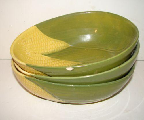 3 SHAWNEE POTTERY CORN PATTERN BOWLS. 2 bowls show chips at top rim. Marked on bottom “95”. 2.75” H, 9” L