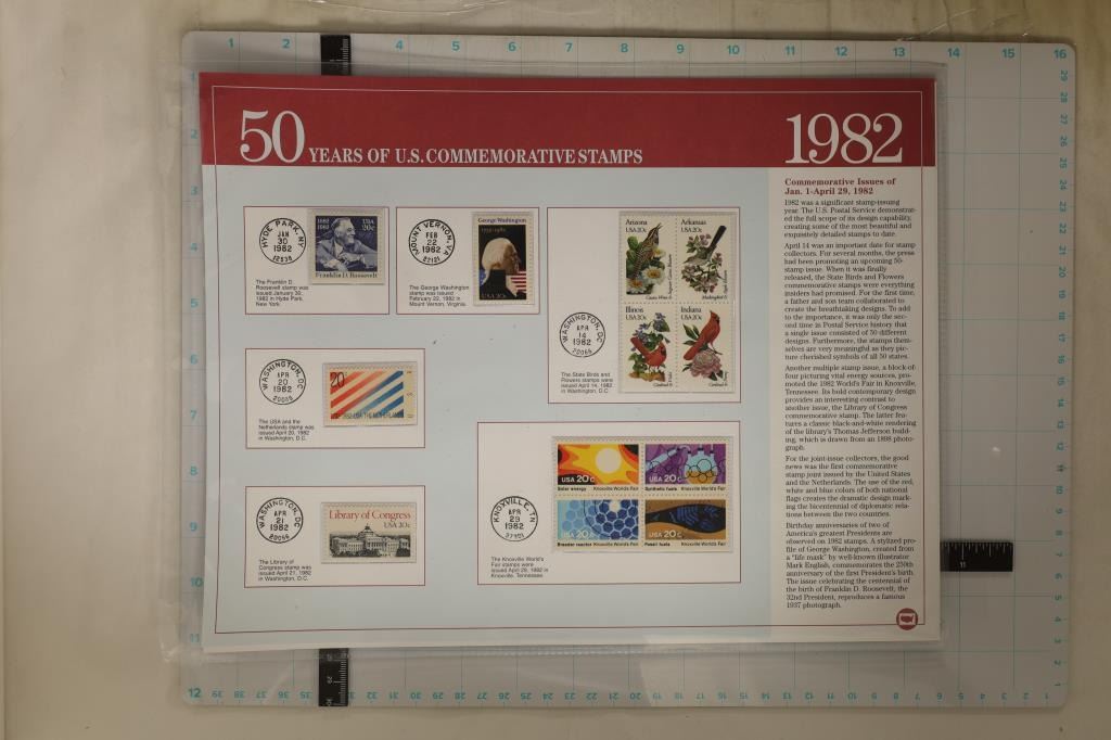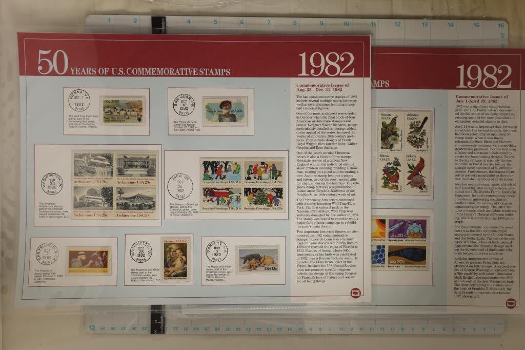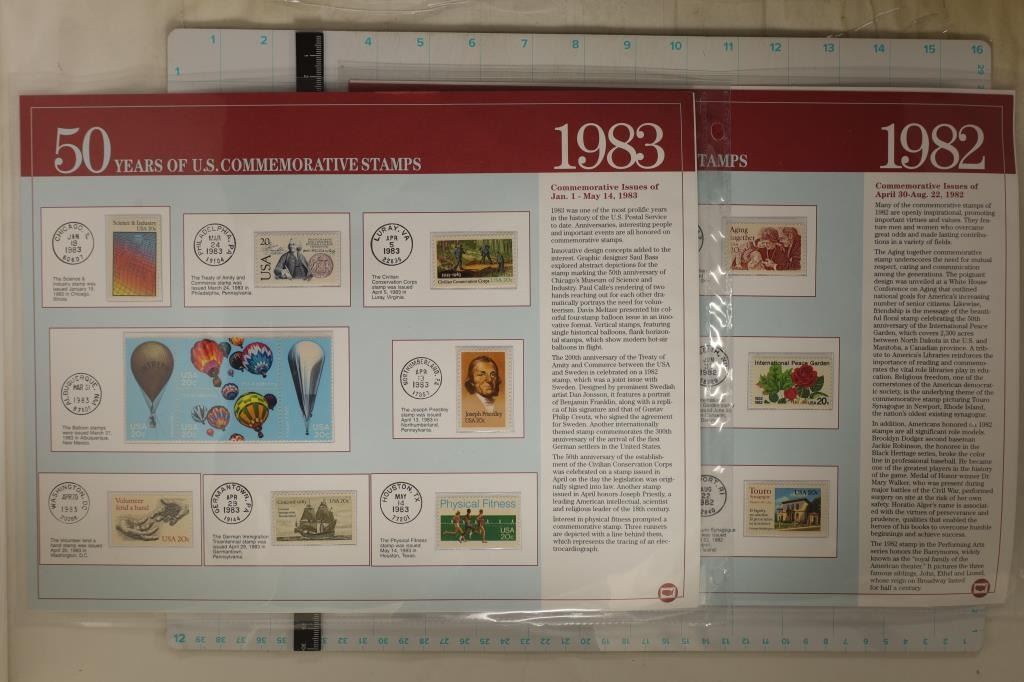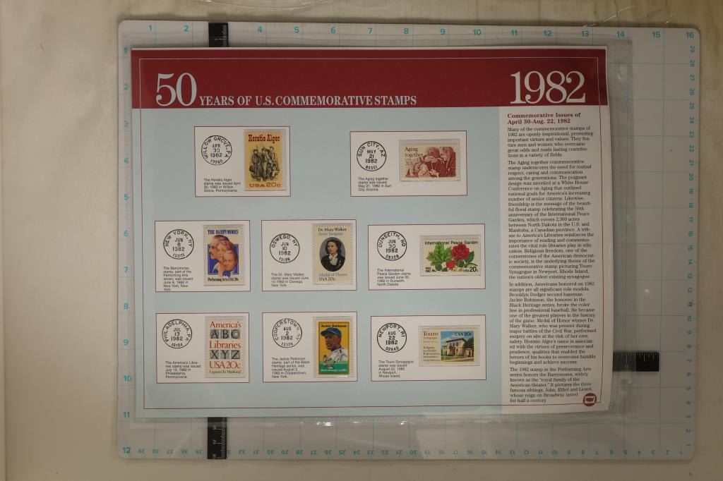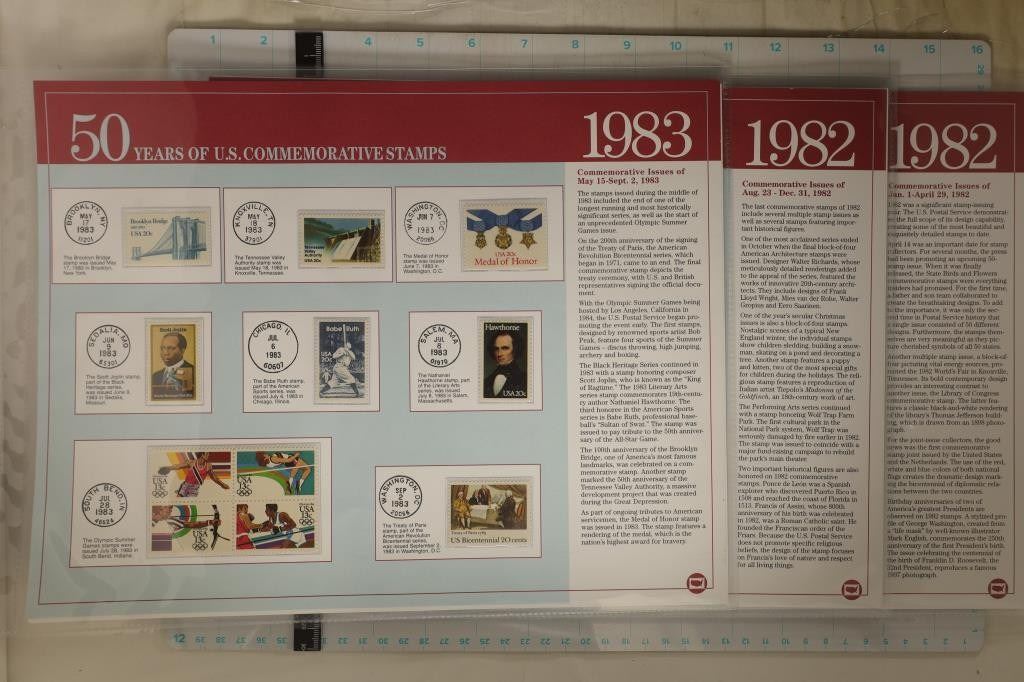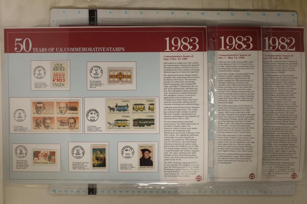 STAMPS ON INFO CARDS: 68 TOTAL FROM 1982-1983, IN PLASTIC SHEETS, PAGES ARE TWO SIDED. $13.60 IN POSTAGE THAT CAN BE USED