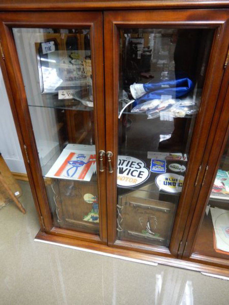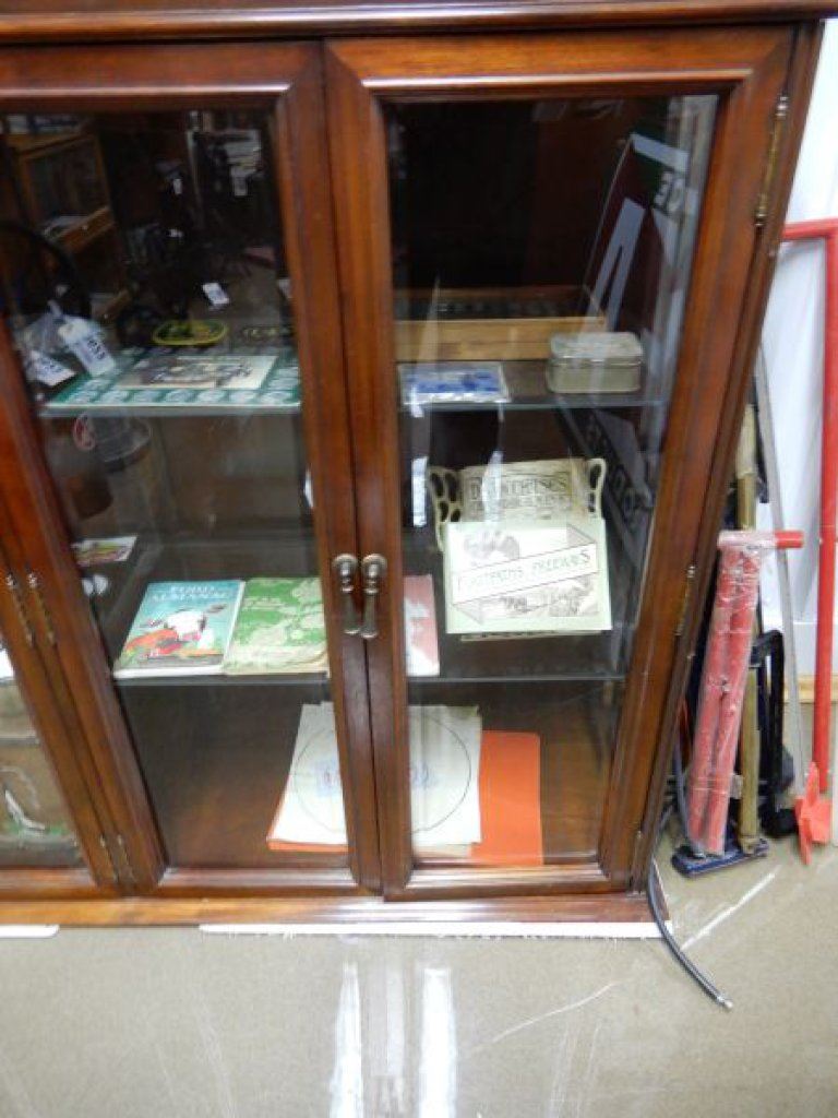 3 SHELF MAHOGONY TOPPER BEVILLED GLASS- 61 1/2" X 17 1/2" X 48 1/4" - CONTENTS NOT INCLUDED LOCATION: LOWER BACKROOM