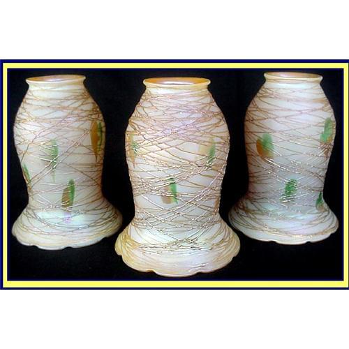<table width="100%" border="0" cellspacing="0" cellpadding="4"><tr><td><em> </em></td></tr><tr> <td width="100%"> Set of 3 MINT signed Quezal glass iridescent lamp shades. Made early 20th century.<BR>6 1/4inches high.<BR>Tulip shaped with scalloped bottom rims. Upper rims are slightly over 2inches diam (which, I believe, indicates made for electric fittings). The insides are a glorious iridescent gold, the outside a pearly white with spiderweb threads profusely covering the surface and marvered heart and vine in green and gold. Fabulous iridescence.<BR>Each shade is signed QUEZAL on the rim.<BR>Excellent condition. No chips/cracks. </td></tr><tr> <td> </td></tr><tr> <td>Reference #: 2348</td></tr><tr><td>Condition:See Description</td></tr><tr><td>Year:See Description</td></tr><tr><td>Title:3 SIGNED QUEZAL IRIDESCENT LAMP SHADES</td></tr><tr><td>Location:Boca Raton</td></tr></table>