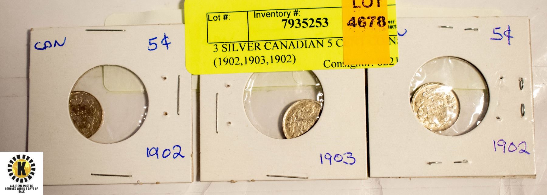 3 SILVER CANADIAN 5 CENT COINS (1902,1903,1902)