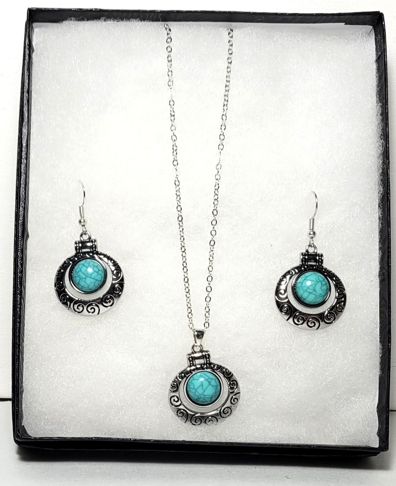 TURQUOISE PENDANT ON 18" CHAIN AND MATCHING DROP EARRINGS. JEWELERY