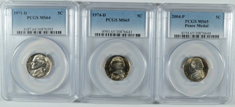 (3) SLABBED PCGS JEFFERSON NICKELS (71-D, 74-D, 04 HS) PCGS MS-64/65