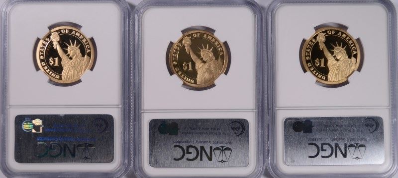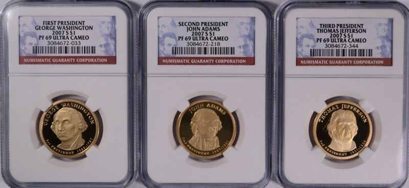 (3) SLABBED PROOF PRESIDENTAL DOLLAR'S (G. WASHINGTON, J. ADAMS, T. JEFFERSON) N