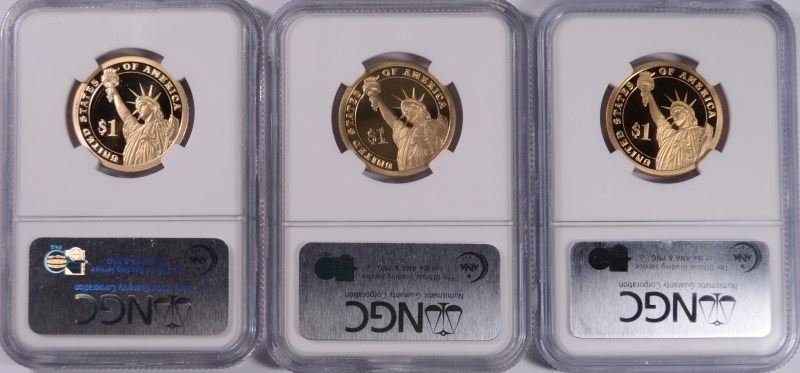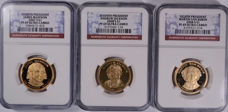 (3) SLABBED PROOF PRESIDENTAL DOLLAR'S (J. MADISON, A. JACKSON, M. VAN BUREN) NG