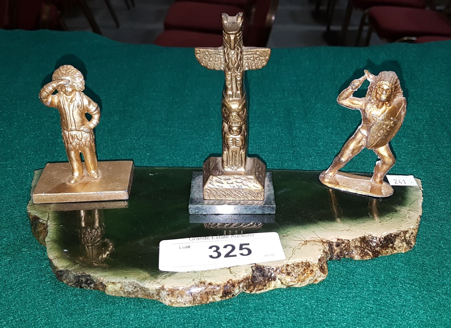 3 SMALL VINTAGE BRASS NATIVE STATUES ON JADE SLAB