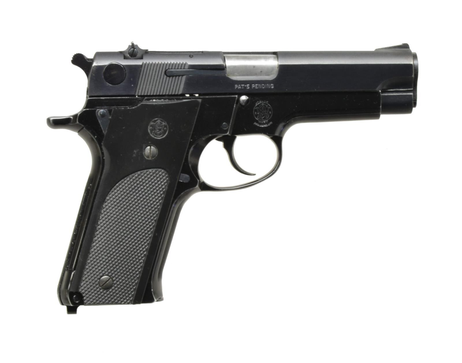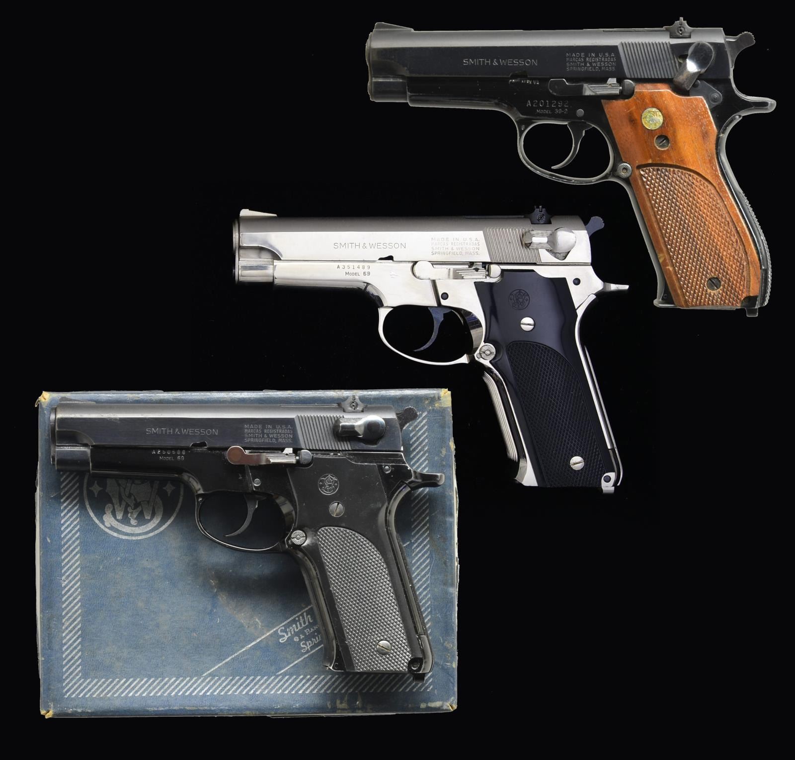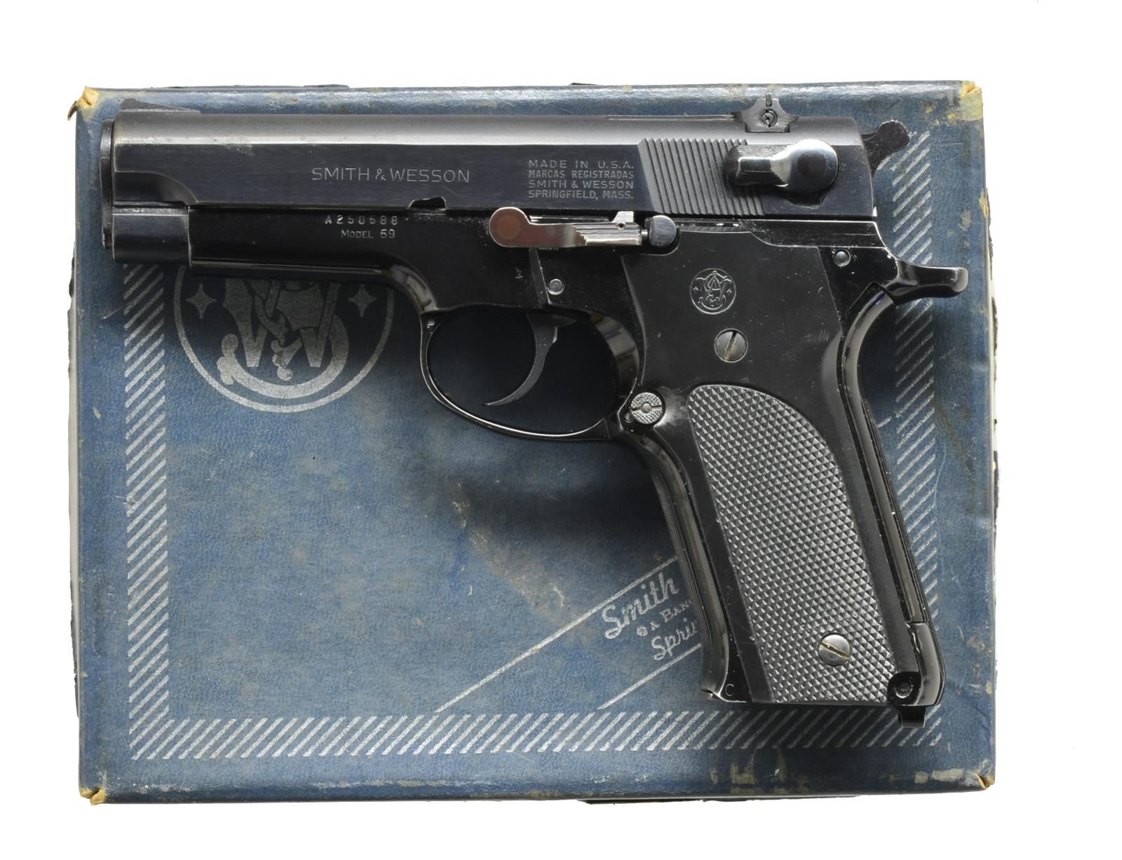 1) MODEL 39-2. Cal. 9mm. S# A201292. Bbl. 4". Dbl. action. This pistol has checkered walnut grips, adj. sights & alloy frame. Top of bbl. marked “9mm”. Frame has import mark above S#. MAGS: 1 blued steel. 8 rd. & 1 stainless 8 rd. w/ plastic base plate (will not latch properly). CONDITION: retaining approx. 90% original finishes w/ high edge wear & some scattered pitting on slide. Some scratches on frame rear strap, front somewhat silvered. Grips w/ light marks. Bright shiny bore. Mechanically good. (20-3640/MGM). 2) MODEL 59 W/ NICKEL FINISH. Cal. 9mm. S# A351489. Bbl. 4". Adj. rear sight. Nickel finish slide & steel frame w/ black plastic grips. MAGS: 2 blued 14 rd. UNATTACHED ACCESSORIES: gray box containing paperwork. CONDITION: retaining over 90% nickel w/ some light marks overall. Finish peeling above trigger guard on right side of frame & bubbling behind right grip at upper left. Also w/ some lifting of finish on left side behind S# & model. Grips are fine. Bright shiny bore. (20-3644/MGM). 3) MODEL 59 BLUED FINISH W/ ALLOY FRAME. Cal. 9mm. S# A250588. Bbl. 4". Adj. sights. Black alloy frame. Both frame straps grooved. MAGS: 1- 14 rd., 1- 14 rd. w/ plastic base. UNATTACHED ACCESSORIES: blue S& W box w/ sticker numbered to this gun w/ wrapping paper & extra mag. CONDITION: retains 90% of finishes w/ a scattering of light marks & some areas of cleaning w/ associated pitting on left side of frame at top front. High edge wear is evident on frame. Black nylon grips have a few light scratches. Bore is bright & shiny. Mechanically good. (20-3647/MGM). ALL MODERN. $800-1,200.