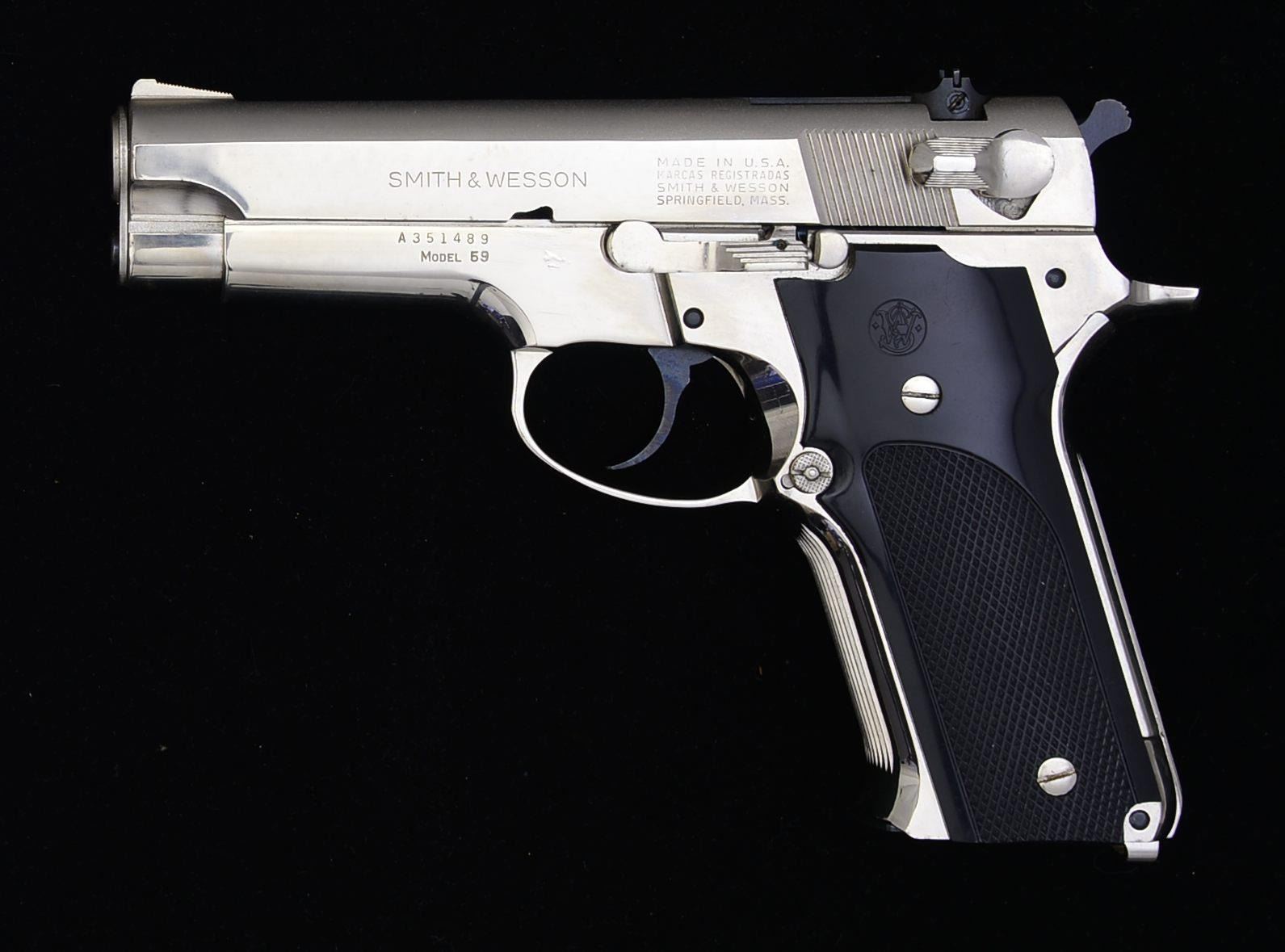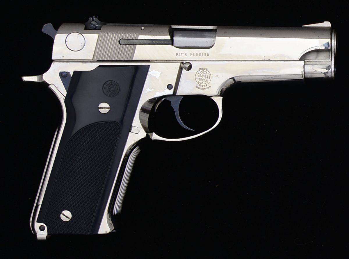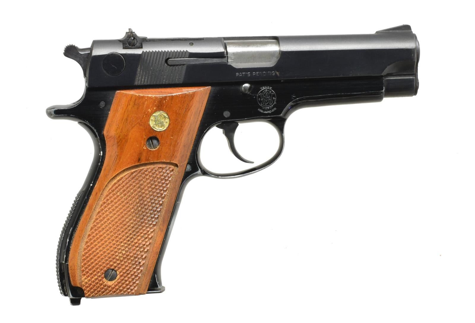 1) MODEL 39-2. Cal. 9mm. S# A201292. Bbl. 4". Dbl. action. This pistol has checkered walnut grips, adj. sights & alloy frame. Top of bbl. marked “9mm”. Frame has import mark above S#. MAGS: 1 blued steel. 8 rd. & 1 stainless 8 rd. w/ plastic base plate (will not latch properly). CONDITION: retaining approx. 90% original finishes w/ high edge wear & some scattered pitting on slide. Some scratches on frame rear strap, front somewhat silvered. Grips w/ light marks. Bright shiny bore. Mechanically good. (20-3640/MGM). 2) MODEL 59 W/ NICKEL FINISH. Cal. 9mm. S# A351489. Bbl. 4". Adj. rear sight. Nickel finish slide & steel frame w/ black plastic grips. MAGS: 2 blued 14 rd. UNATTACHED ACCESSORIES: gray box containing paperwork. CONDITION: retaining over 90% nickel w/ some light marks overall. Finish peeling above trigger guard on right side of frame & bubbling behind right grip at upper left. Also w/ some lifting of finish on left side behind S# & model. Grips are fine. Bright shiny bore. (20-3644/MGM). 3) MODEL 59 BLUED FINISH W/ ALLOY FRAME. Cal. 9mm. S# A250588. Bbl. 4". Adj. sights. Black alloy frame. Both frame straps grooved. MAGS: 1- 14 rd., 1- 14 rd. w/ plastic base. UNATTACHED ACCESSORIES: blue S& W box w/ sticker numbered to this gun w/ wrapping paper & extra mag. CONDITION: retains 90% of finishes w/ a scattering of light marks & some areas of cleaning w/ associated pitting on left side of frame at top front. High edge wear is evident on frame. Black nylon grips have a few light scratches. Bore is bright & shiny. Mechanically good. (20-3647/MGM). ALL MODERN. $800-1,200.
