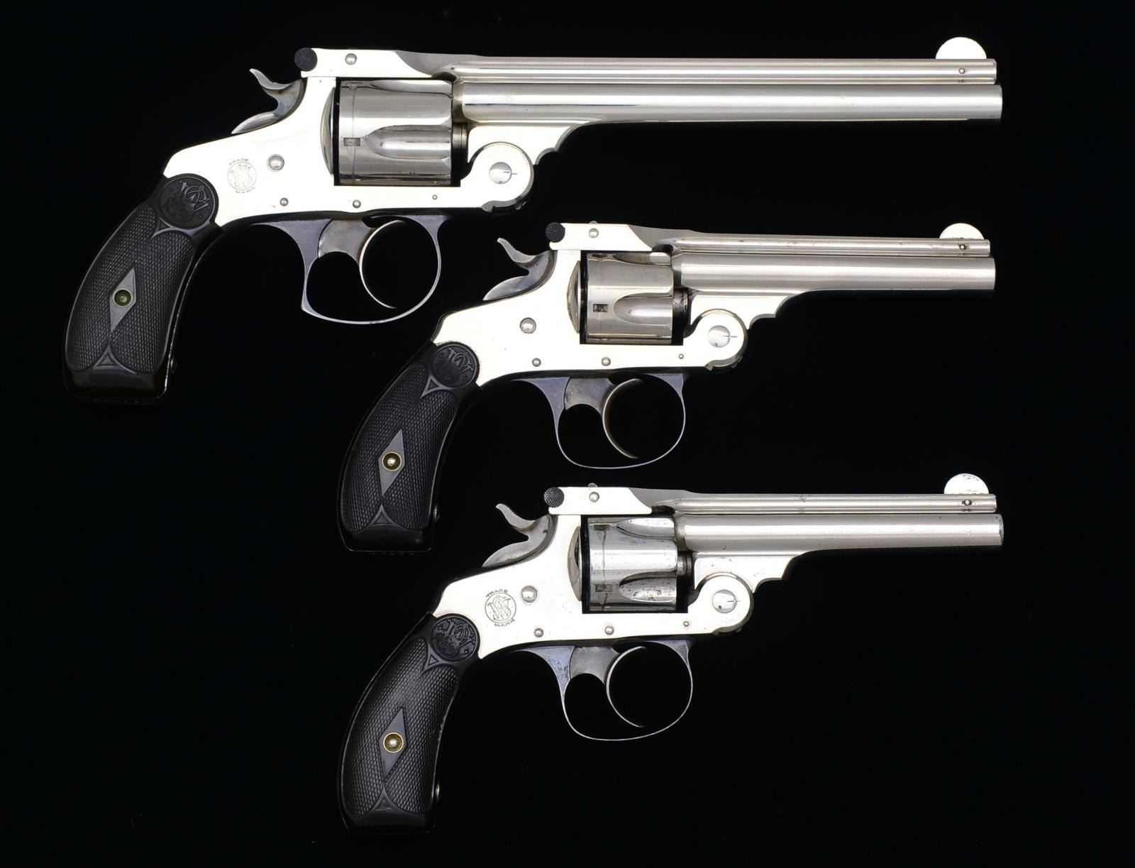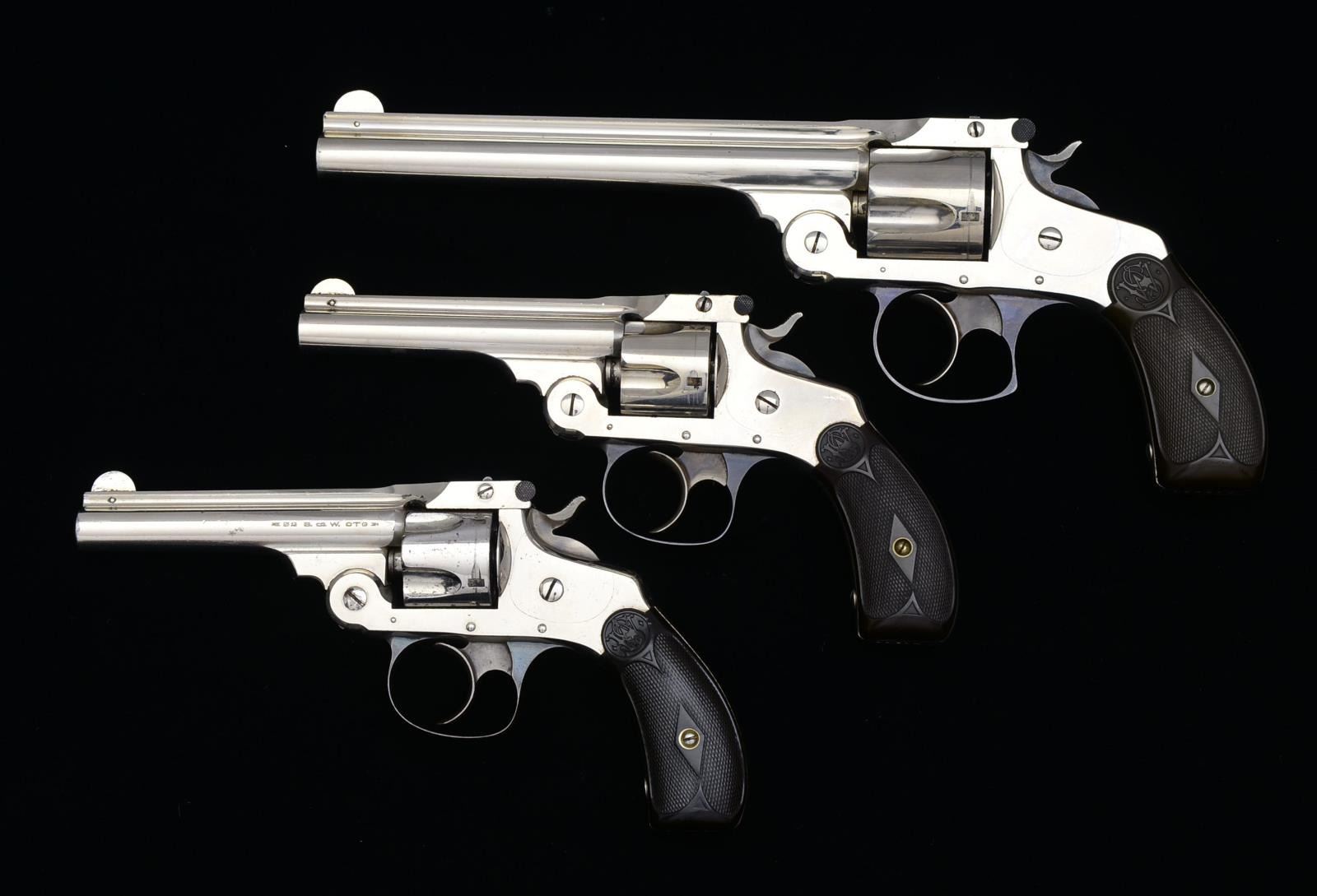1) 32 DA 4TH MODEL. Cal. 32 S&W. S# 78188. Bbl. 3 1/2" w/ rib & semicircular sight. 5 Shot fluted cyl. nickel finished action w/ blued trigger guard having case colored hammer & trigger. 2 Piece checkered hard rubber grips. CONDITION: very fine condition retaining over 98% metal finish. Grips show light wear. Bright bore w/ strong rifling. (20-3751/DS). 2) 38 DA 4TH MODEL. Cal. 38 S&W. S# 361930. Bbl. 6" w/ rib & semi circular sight. 5 Shot fluted cyl. Nickel finished top break action w/ blued trigger guard having case colored hammer & trigger. 2 Piece hard rubber grips. CONDITION: very fine condition retaining over 97% finish showing cyl. drag line w& a few handling marks. Grips show light wear, right panel has hairline crack at toe. Bore retains sound rifling showing scattered spots of pitting. (20-3812/DS). 3) 32 DA 4TH MODEL. Cal. 32 S&W. S# 260610. Bbl. 3 1/2" w/ rib & semicircular sight. 5 Shot fluted cyl. Nickel finished action w/ blued trigger guard having case colored hammer & trigger. 2 Piece hard rubber grips. CONDITION: very fine retaining over 95% metal finish showing scattered scratches & handling marks. Grips show light wear. Bore shows light pitting. (20-3833/DS). ALL CURIO. $900-1,200.
