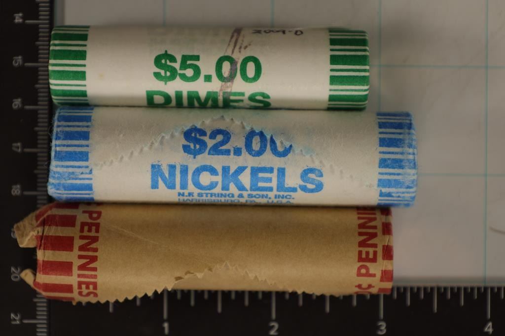 CENT ROLL OF 2007 LINCOLN CENTS (50 COINS), $2 ROLL OF 2003-P JEFFERSON NICKELS (40 COINS) AND $5 ROLL OF 2009-D ROOSEVELT DIMES (50 COINS)
