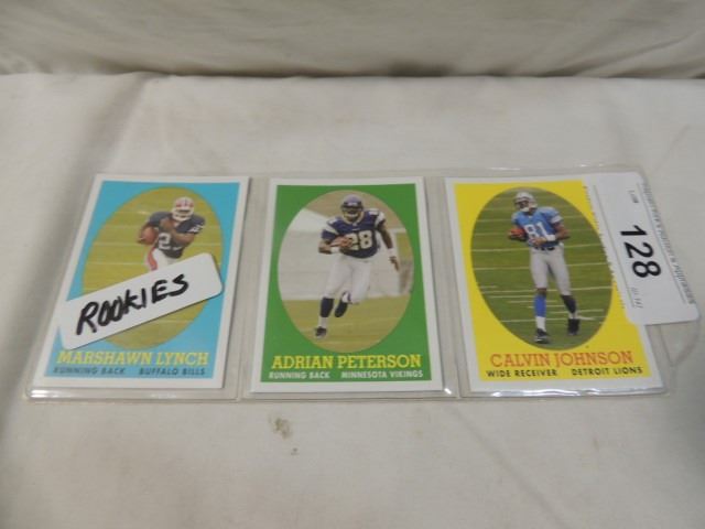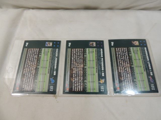 MARSHAWN LYNCH ADRIAN PETERSON CALVIN ALL THREE ROOKIE CARDS IN EXCELLENT CONDITION. AS SHOWN.