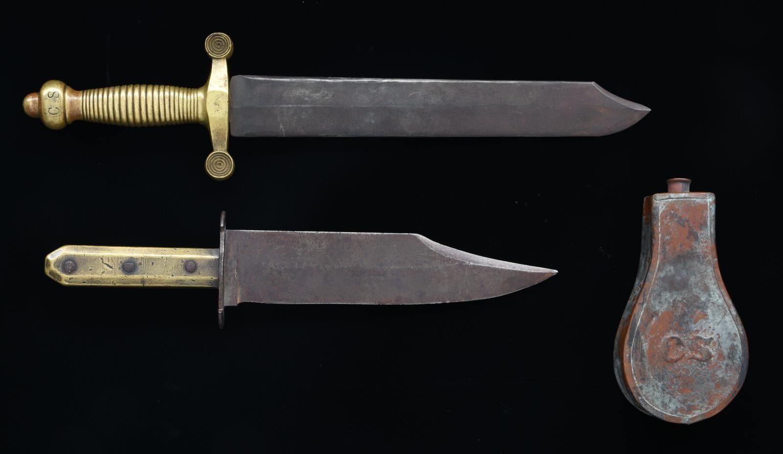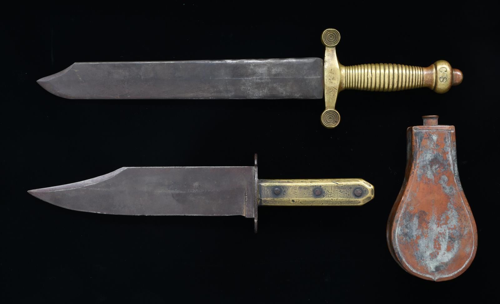 These 3 pieces represent items created in modern times to fool collectors. 1) KNIFE. A bowie type knife made from a French artillery short sword and stamped "C S" on each side of the pommel. Knife measures 16" overall and does not have a sheath. 2) KNIFE. A heavy bowie type knife measuring 13" overall with an 8 1/2" blade and a 3 3/4" false edge. 2-Piece brass grip secured by 3 iron rivets. No sheath. 3)A copper gun powder flask measuring 6 1/4" in height with "C S" embossed on the face. CONDITION: the 3 items above combine artificial aging and simulated use to make them appear older than they are. PROVENANCE: From the Collection of James B. Taylor. (02-19902-2/BF). $100-300.