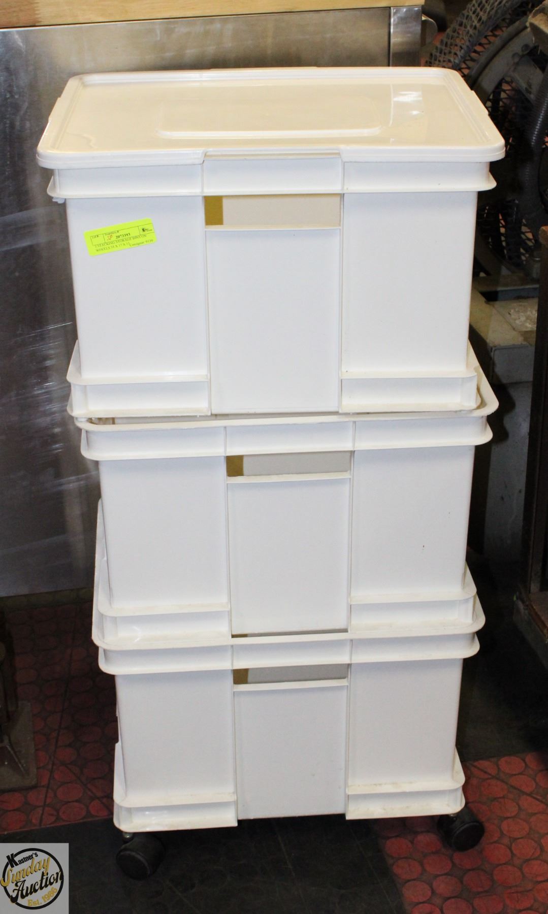 3 STACKING STORAGE BINS ON WHEELS 34 X 17 X 13