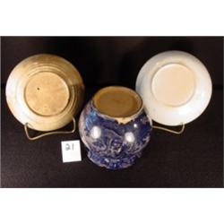 Lot of 3 Staffordshire blue & white transferware: 2 deep saucers, one w/cup well; sugar bowl without lid AS IS; ink stamped "Bride of Lammermoor".