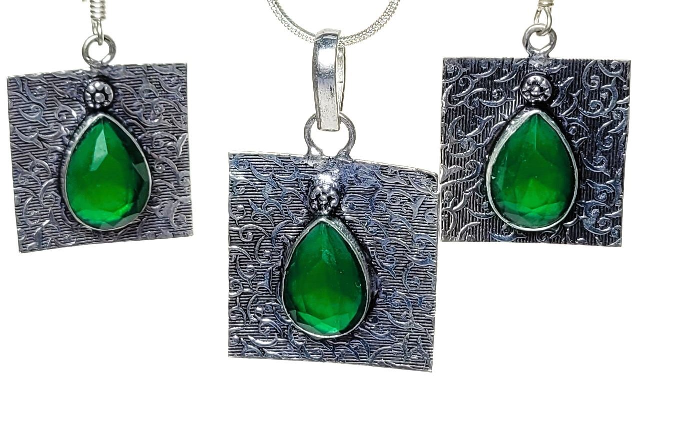 PENDANT ON 20" CHAIN, LAB CREATED TEARDROP EMERALDS. JEWELRY