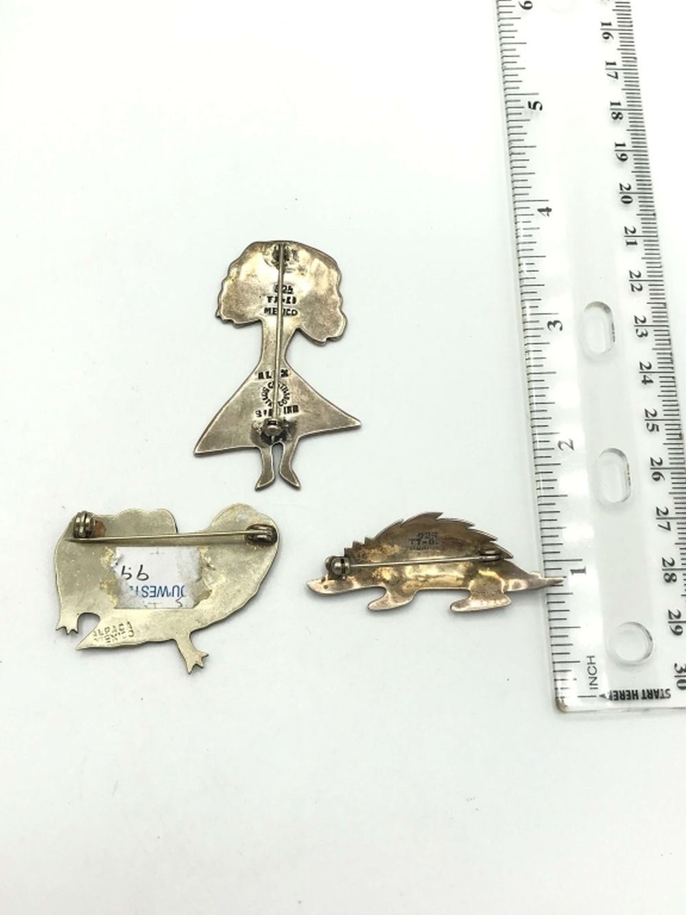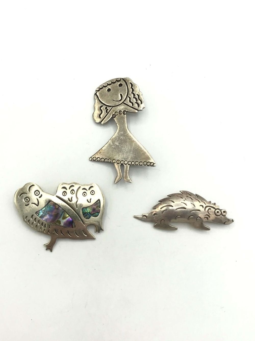 3 STERLING BROOCHES OWL, GIRL, PORCUPINE