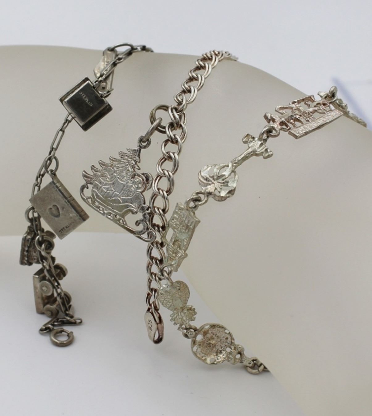 3 STERLING SILVER CHARM BRACELETS. VARIOUS LENGTHS AND CHARMS ON EACH. TOTAL WEIGHT: 26.5 GRAMS. PRE-OWNED. ESTIMATE: $50-$75