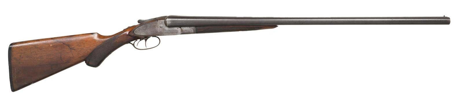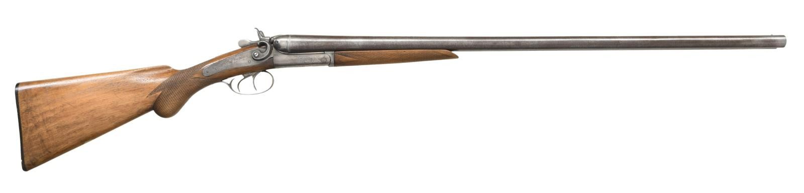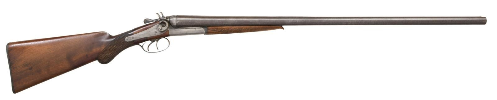 1) F. DOMOULIN & CO. HAMMER. Cal. 12 GA. S# 1462. Bbl 30". Lockplates are stamped "F. DUMOULIN & CO., with "BELGIUM" also stamped on the right lockplate. Barrel rib is stamped "BELGIUM FINE LAMINATED STEEL". Belgian proofs are stamped on the underside of the barrels and on the water table. Case colored frame with damascus barrels. Furniture is comprised of a checkered wood round knob stock, with a checkered wood forend. Stock and forend have been lightly sanded and revarnished at one time. CONDITION: frame retains scant traces of its original case color hardened finish, retaining a mostly gray patina and exhibiting some light surface oxidation overall. Barrels exhibit wear and show some scattered areas of age related discoloration. Mirror bores. Wood furniture shows some scattered marks from handling and storage, but otherwise remains sturdy and serviceable. (23-2007/MLW). 2) HENRY ARMS BACK ACTION HAMMER. Cal. 12 GA. S# 385. Bbl 29 3/4". Marked "HENRY ARMS CO" on lockplates, with LAMINATED STEEL . BELGIUM" on the barrel rib. Belgian proofs are present on the underside of the barrels and on the water table. Frame is case color hardened and is mounted with a checkered wood round knob buttstock and checkered splinter pattern forend. Solid rib, with brass bead front sight. CONDITION: frame retains traces of its case colored finish, with the balance exhibiting a gray patina with scattered spots of darker discoloration. Barrels exhibit a dark patina, with light surface oxidation. Mirror bores. Wood furniture shows some scattered marks from handling and storage, but are otherwise good. (23-2033/MLW). 3) AMERICAN GUN CO. KNICKERBOCKER. Cal. 12 GA. S# NSN. Bbl 28 1/8". Frame is marked "AMERICAN GUN Co./ NEW YORK" on the right, with "KNICKERBOCKER". Barrels are stamped "GENUINE ARMORY STEEL."/ CHOKE BOBET". Solid matte rib with brass bead front sight. Checkered wood buttstock with checkered splinter pattern forend. CONDITION: frame exhibits a mottled gray patina, with scattered spots of darker oxidation overall. Barrels exhibit wear that shows through to gray patina, and also shows some light surface oxidation. Very bright bores, with some scattered pitting throughout. (23-2036/MLW). ALL CURIO. $300-500