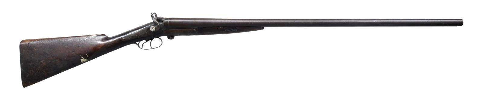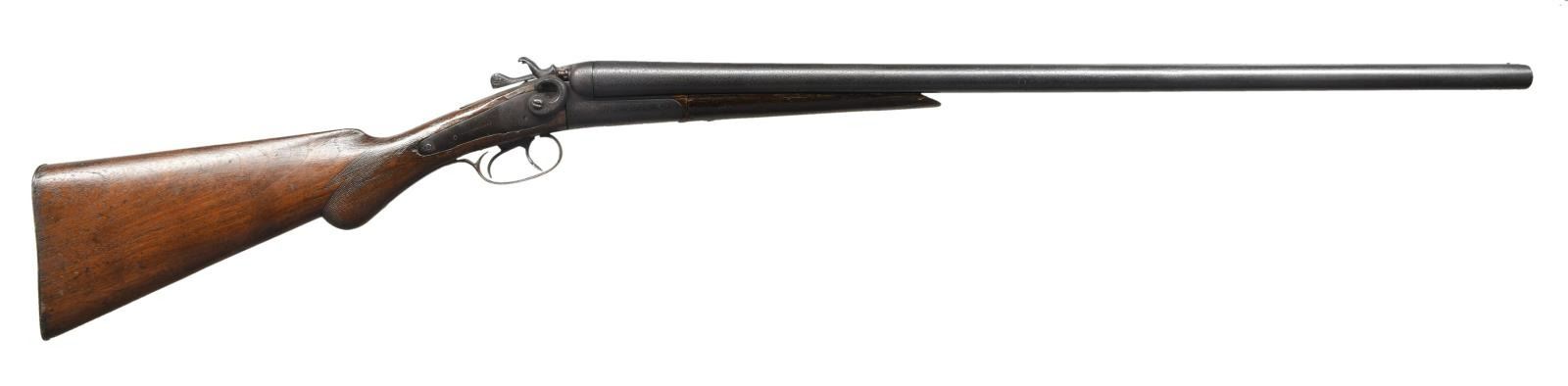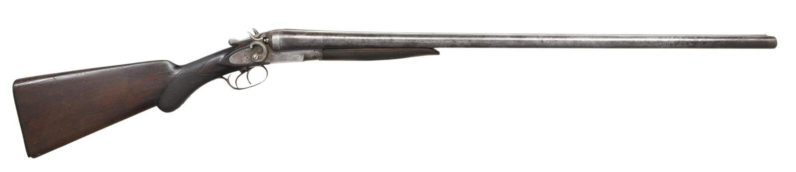1) WM. MOORE SIDE LEVER HAMMER. Cal. 12 GA. S# NSN. Bbl 32 1/8". Lockplates are marked "WM MOORE & Co.", with light scroll engraving that is also present on the receiver and receiver tangs. Barrel rib is marked "LONDON FINE TWIST". Right hammer and hammer screw are replacements. Furniture is comprised of a checkered wood buttstock with a blank escutcheon, as well as a checkered wood splinter pattern forend which has a much later added white triangular plastic inlet at the tip. CONDITION: metal components exhibit a dark mottled gray patina, with areas of dark discoloration overall. Bores exhibit pitting throughout. Stock and forend are heavily smoothed from use and exhibit scattered marks from handling and storage overall. Forend bears a few losses along the edges. (23-1909/MLW). 2) BELGIAN HAMMER. Cal. 12 GA. S# NSN. Bbl 29 1/2". Left lockplate is indiscernible, with the right lockplate being stamped "MACHINE MADE". Belgian proofs on underside of barrel. Solid rib with brass bead front sight. Furniture is comprised of a checkered wood round knob buttstock and checkered forend. CONDITION: metal components exhibit a heavy dark and pitted surface overall. Bore exhibits pitting throughout. Stock and handguard show scattered marks from handling and storage, with the handguard showing a loss on the left side. (23-1915/MLW). 3) BELGIAN PROOFED MANHATTAN ARMS CO. Cal. 12 Ga., 2 3/4". S# 176667. Damascus finished 30" w/ Pieper breech. Concave matte rib marked "PATENT 488366 DECB 20 1892" w/ brass bead. IC & Mod chokes. Sideplate action marked "MANHATTAN ARMS CO" w/ rebounding hammers, dbl. triggers, & extractors. Checkered walnut stock set. LOP: 13 3/4" to hard rubber buttplate. CONDITION: metal shows traces of Damascus finish balance being a fair gray/brown patina w/ light pitting. Wood has fair varnish w/ worn checkering, cracks, scratches, dents & sm. chip at toe. Forearm has sm. hole in front of refreshed checkering. Fair worn buttplate w/ chip at toe. Fair pitted bores. Top lever is loose. Breech shows sm. gap at face & water table. Left lock appears functions. Right lock appears to not hold at full cock (gunsmith attention needed). (23-1926/MD). ALL CURIO. $200-350.
