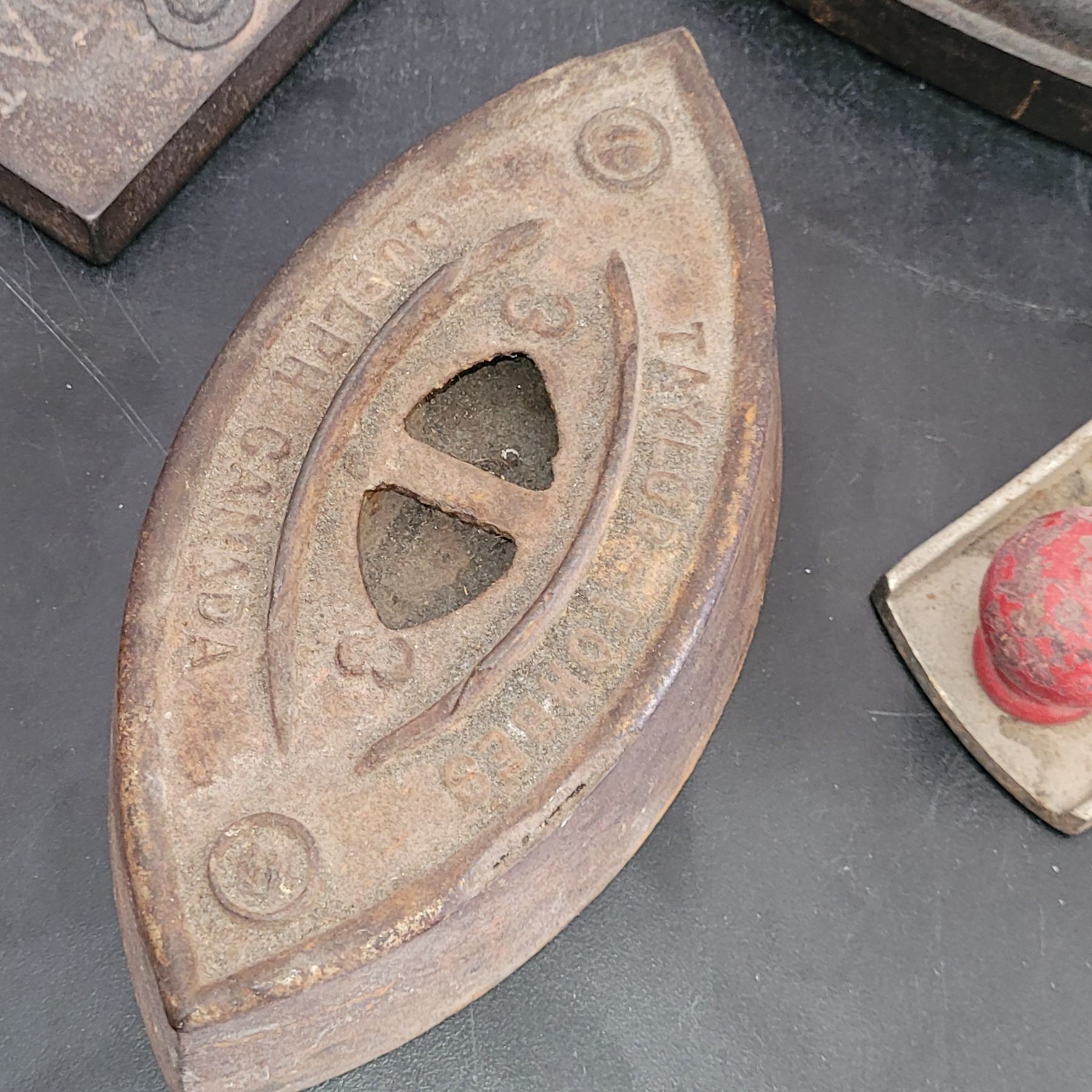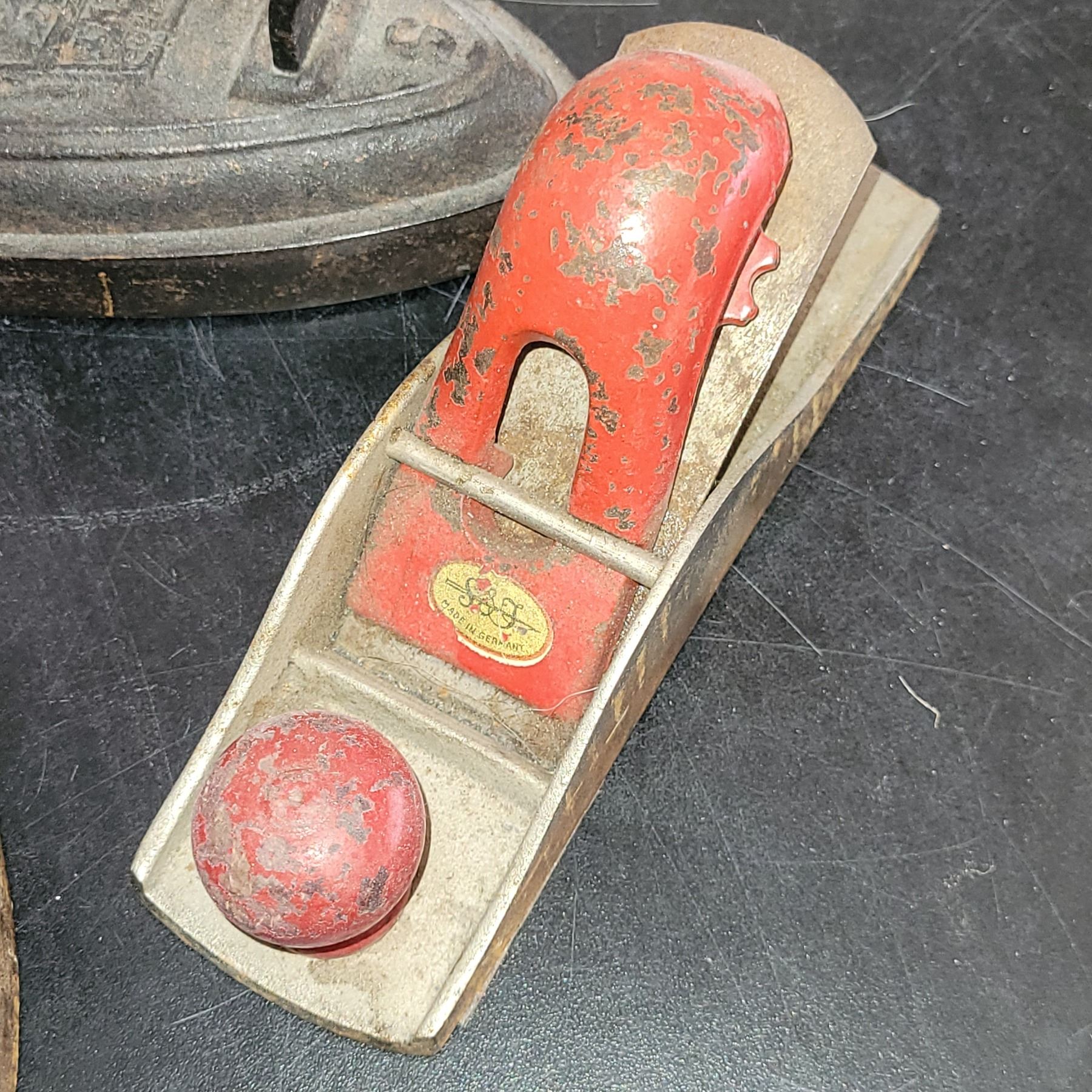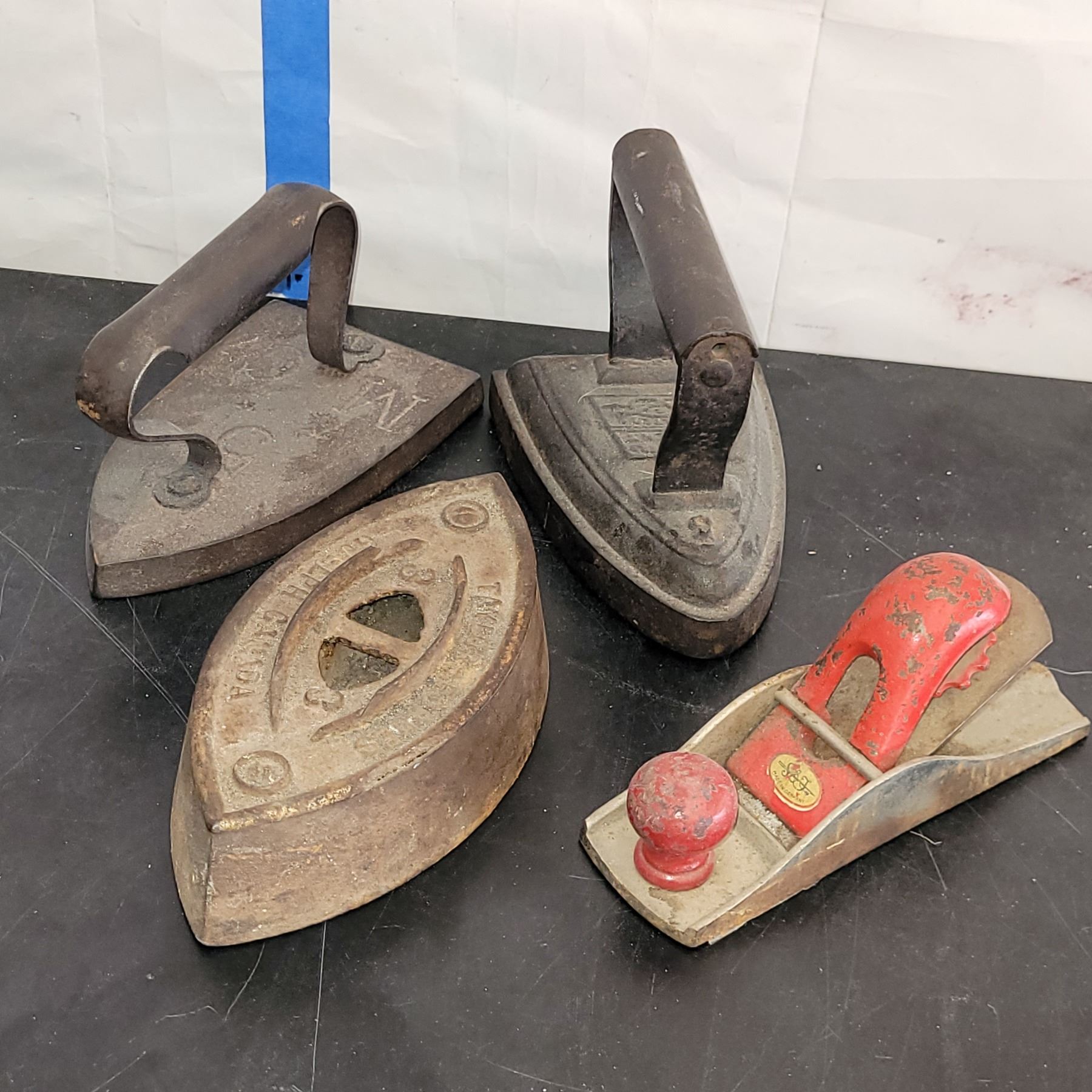 #3 Sad Iron, Old Wood Plane, #5 and #5 Sad Irons