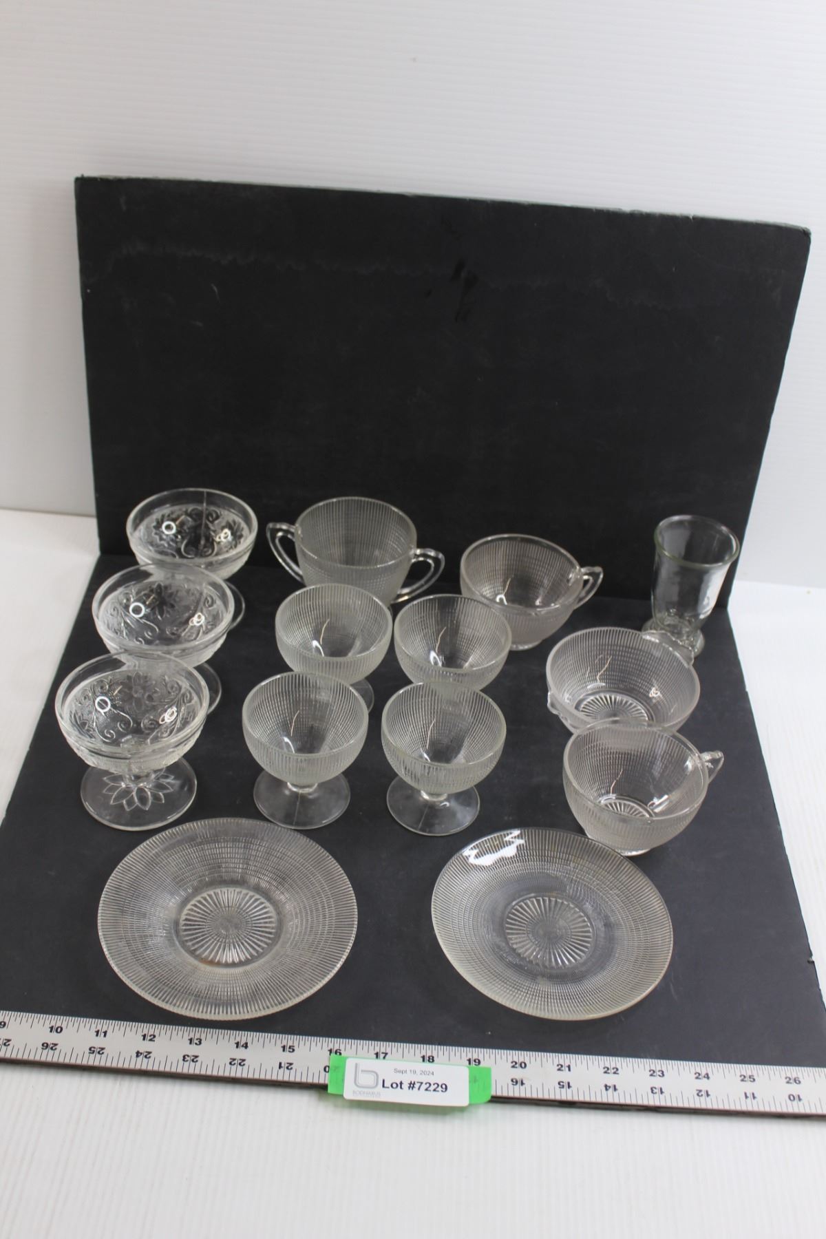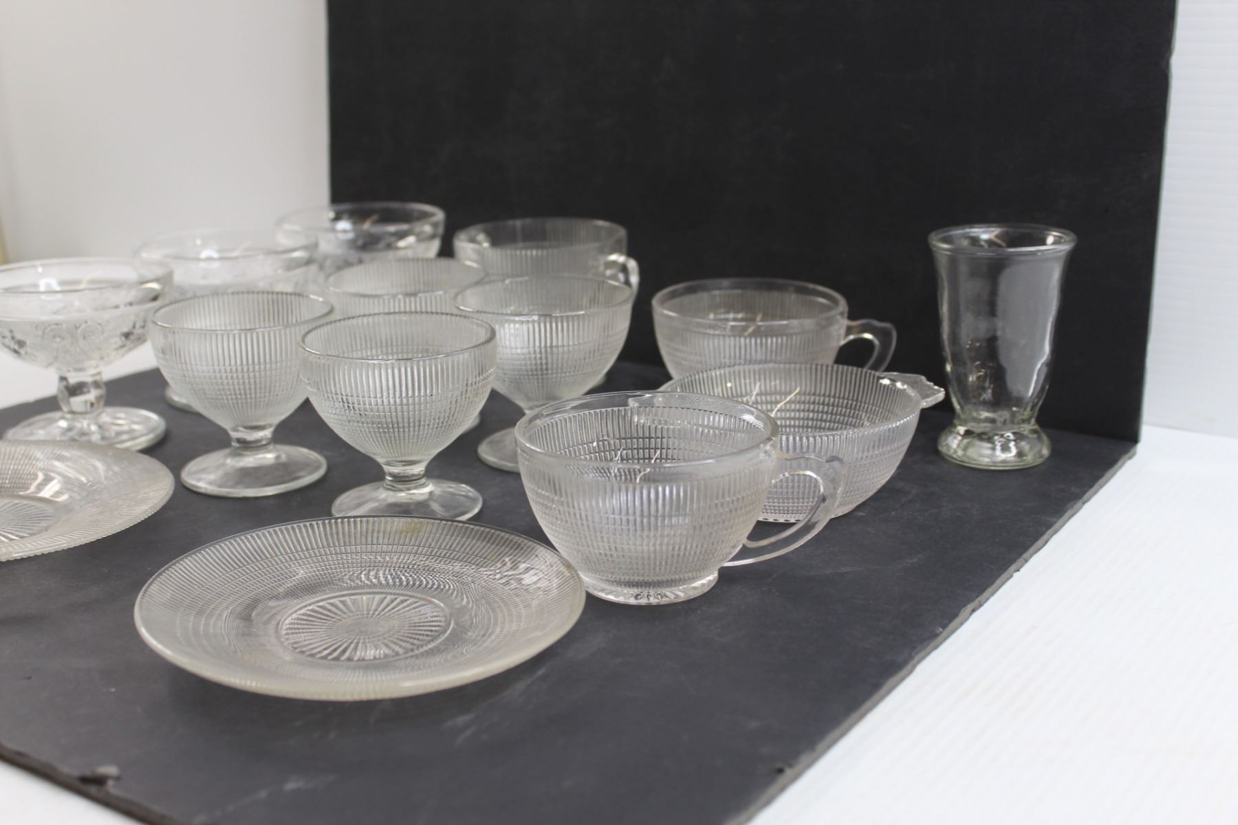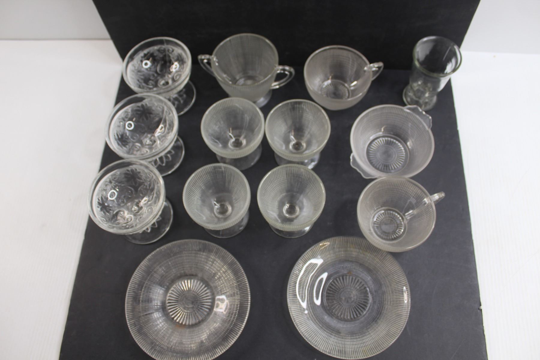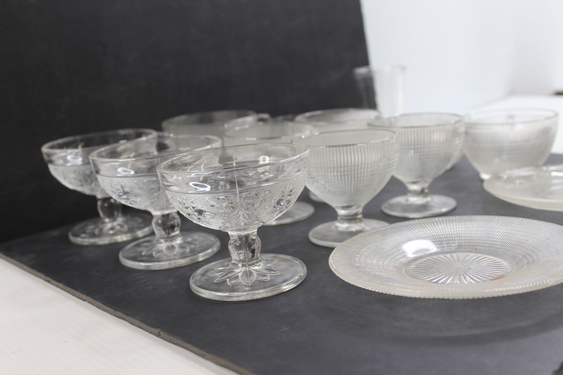 (3) Sandwich Pattern Sherbert Dishes and (10) Saguenay Pattern Dishes
