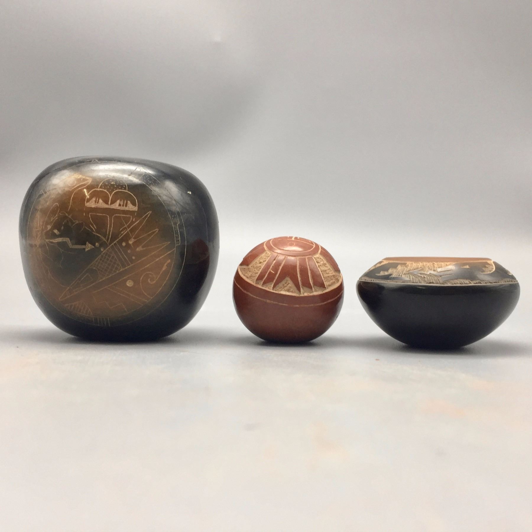 Maker: Katherine Wanpovi, Geri Naranjo, Tom Tapia. Approx. Age: Fairly modern. Size: 1) 1 3/4” w x 1 3/4” h. 2) 1 3/8” w x 7/8” h. 3) 1” w x 1” h. Additional Info: Group of 3 Santa Clara mini seed pots. Condition: Good, New, old stock (NOS) from dealer who is retiring. Please look closely at the pictures - they are an important part of our description. Shipping: There will be a $8 handling / packaging fee for shipping this lot. The actual cost of postage will be added on top of that.