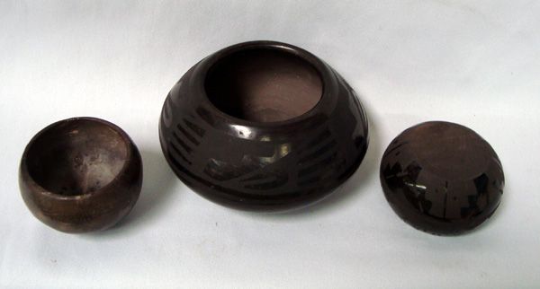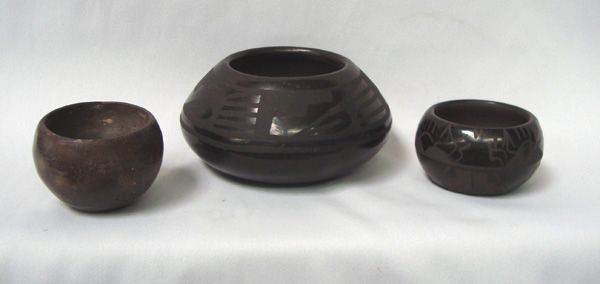 3 Santa Clara Pottery. Black on black. One piece has a signature. Largest piece measures approx. 2''H x 3''W.