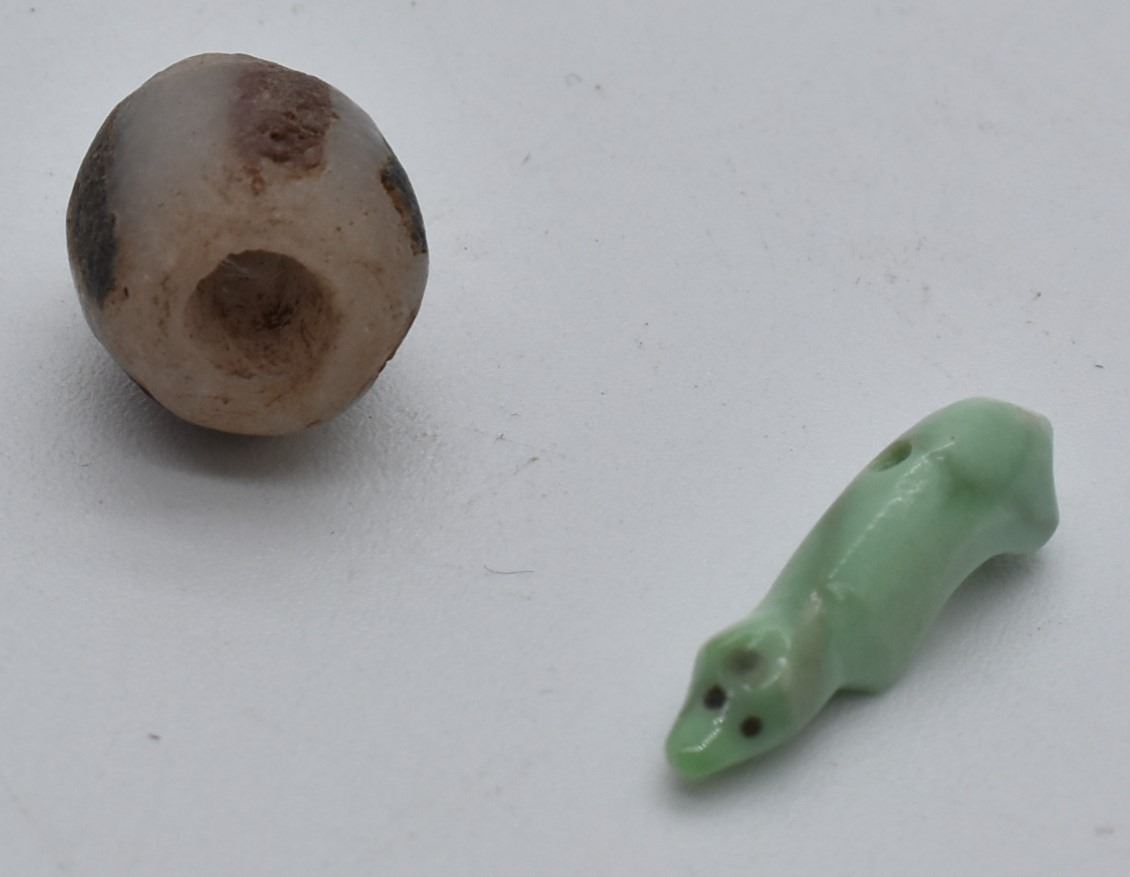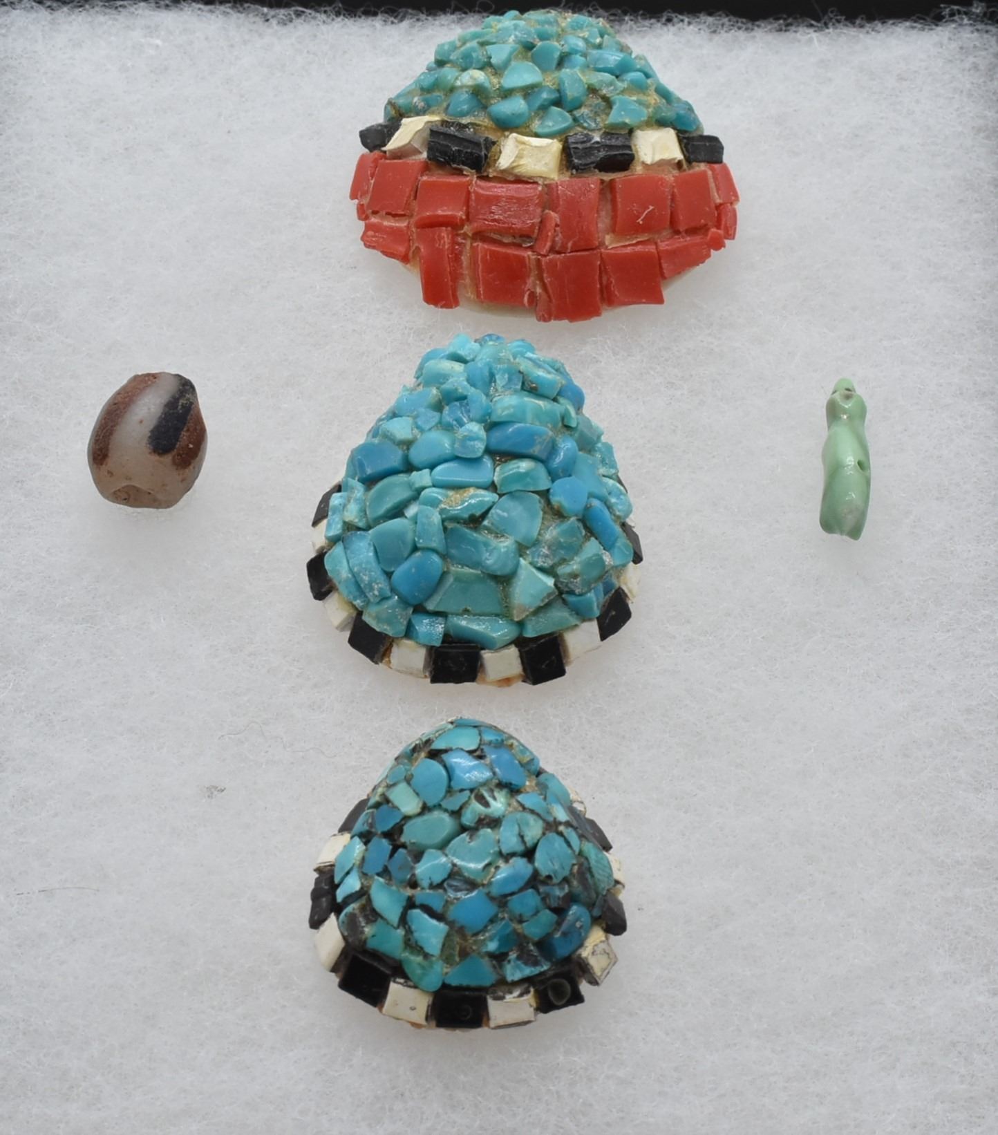 3 Native American Santo Domingo Inlay Shells (ca. 1950s), 1 Zuni Turquoise Fox Fetish Bead (7/8''L), 1 Antique African Ghana Krobo Powderglass Bead (.5''W), largest shell measures 1 5/8'' x 1.75''