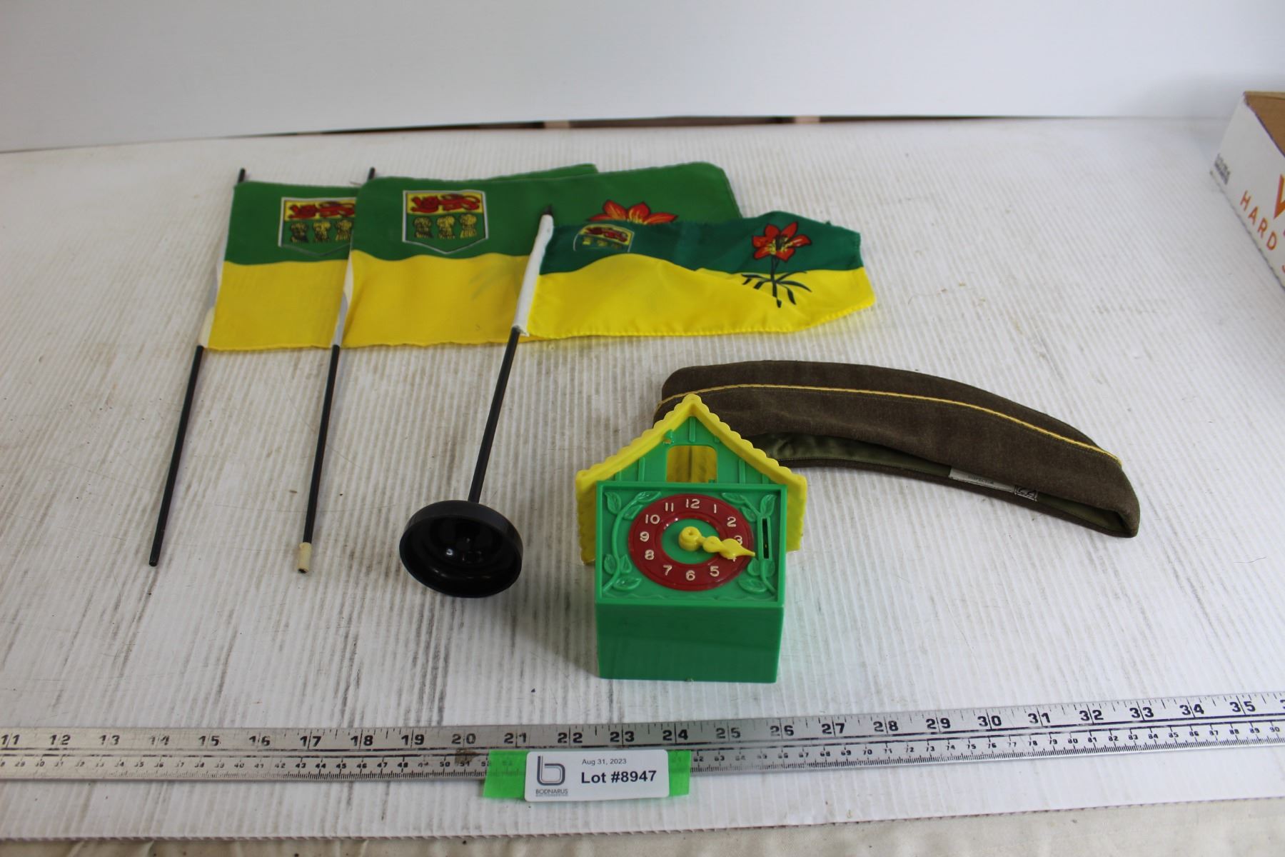(3) Saskatchewan Flags, Wedge Hat, Toy Birdhouse - As Is