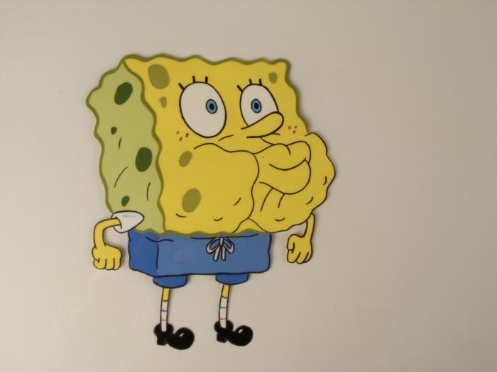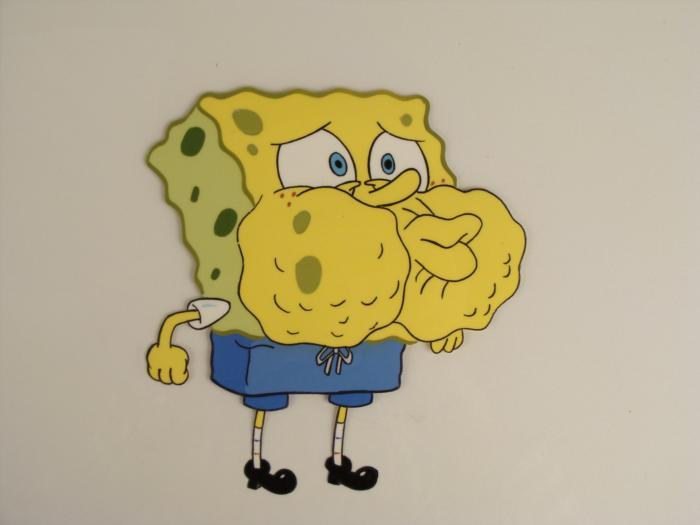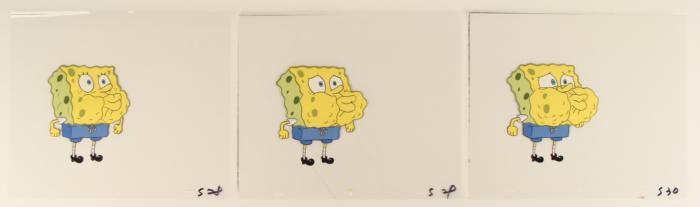 This original animation cel is from the Nickelodeon TV show SpongeBob Squarepants. The story takes place under the deep blue sea in Bikini Bottom, where SpongeBob resides. SpongeBob, who is a yellow, porous sponge, is your typical happy-go-lucky character, as he is always cheerful and enjoys making people laugh. Patrick Star, SpongeBob's neighbor who is a starfish, is your average children's show idiot, as he boasts knowing nothing and is often getting himself into ridiculous situations. Between the homes of these two lies the home of the miserable Squidward, a squid, who is known for being grouchy and playing tricks on SpongeBob and Patrick. Both SpongeBob and Squidward work at the Krusty Krab, a fast food business run by the greedy money-loving Mr. Krabs, a crab, the arch rival of the evil, possibly misunderstood, Plankton. Another neighbor, Sandy Cheeks, an athletic squirrel who normally wears an astronaut's space suit, was introduced in "Tea at the Treedome." She spends most of her time inventing and experimenting. These are three sequential cels of Spongebob. It appears that Spongebob is filling up with nothing but air. Original Production Animated Cel Overall Size of Cel: 10 1/2" x 12 1/2" Excellent ConditionThis is an original hand-painted cel set-up used in the production of an episode of "SpongeBob SquarePants." Each one-of-a-kind set-up represents a slight change in position of the characters. When individually photographed and projected in rapid succession, the images appear to move.