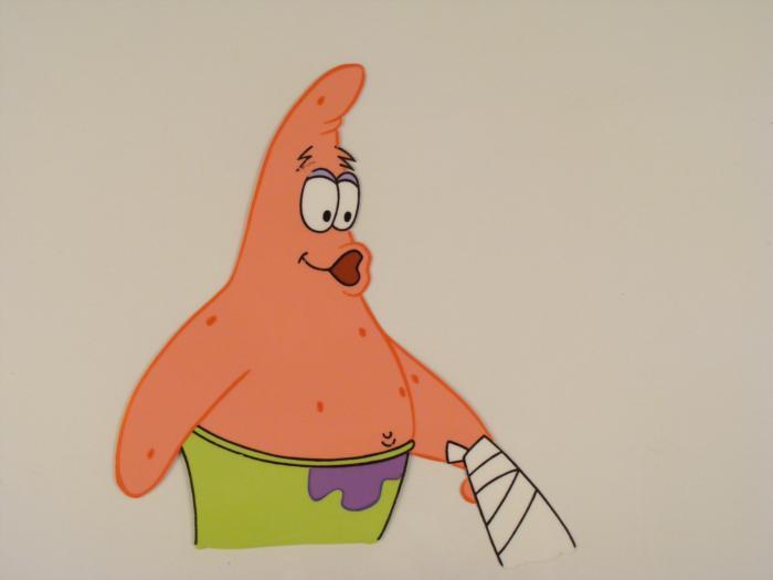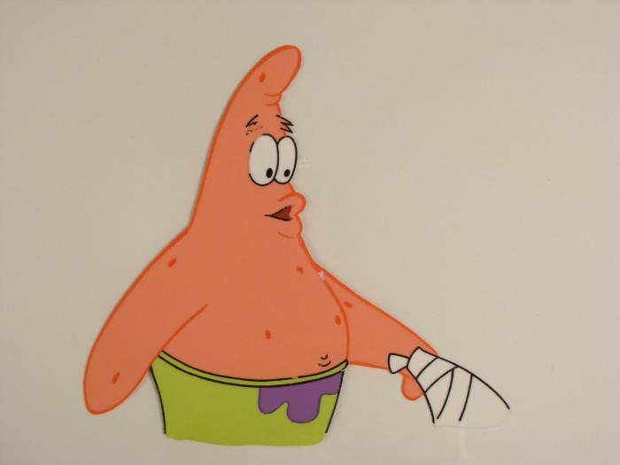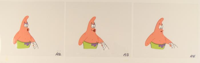 This original animation cel is from the Nickelodeon TV show SpongeBob Squarepants. The story takes place under the deep blue sea in Bikini Bottom, where SpongeBob resides. SpongeBob, who is a yellow, porous sponge, is your typical happy-go-lucky character, as he is always cheerful and enjoys making people laugh. Patrick Star, SpongeBob's neighbor who is a starfish, is your average children's show idiot, as he boasts knowing nothing and is often getting himself into ridiculous situations. Between the homes of these two lies the home of the miserable Squidward, a squid, who is known for being grouchy and playing tricks on SpongeBob and Patrick. Both SpongeBob and Squidward work at the Krusty Krab, a fast food business run by the greedy money-loving Mr. Krabs, a crab, the arch rival of the evil, possibly misunderstood, Plankton. Another neighbor, Sandy Cheeks, an athletic squirrel who normally wears an astronaut's space suit, was introduced in "Tea at the Treedome." She spends most of her time inventing and experimenting. Here are three sequential cels of Patrick. Whistle while you work, Do do doodoo... Have some fun and watch out for your thumb, so whistle while you work...Original Production Animated Cel Overall Size of Cel: 10 1/2" x 12 1/2" Excellent ConditionThis is an original hand-painted cel set-up used in the production of an episode of "SpongeBob SquarePants." Each one-of-a-kind set-up represents a slight change in position of the characters. When individually photographed and projected in rapid succession, the images appear to move.