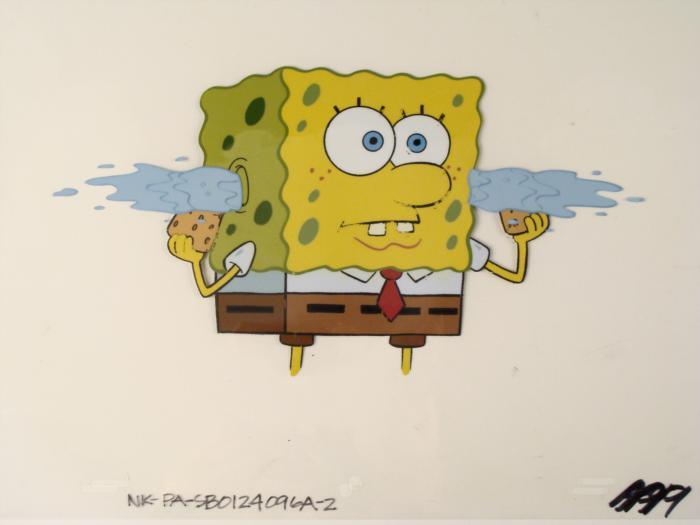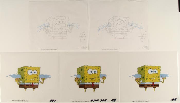 This original animation cel is from the Nickelodeon TV show SpongeBob Squarepants. The story takes place under the deep blue sea in Bikini Bottom, where SpongeBob resides. SpongeBob, who is a yellow, porous sponge, is your typical happy-go-lucky character, as he is always cheerful and enjoys making people laugh. Patrick Star, SpongeBob's neighbor who is a starfish, is your average children's show idiot, as he boasts knowing nothing and is often getting himself into ridiculous situations. Between the homes of these two lies the home of the miserable Squidward, a squid, who is known for being grouchy and playing tricks on SpongeBob and Patrick. Both SpongeBob and Squidward work at the Krusty Krab, a fast food business run by the greedy money-loving Mr. Krabs, a crab, the arch rival of the evil, possibly misunderstood, Plankton. Another neighbor, Sandy Cheeks, an athletic squirrel who normally wears an astronaut's space suit, was introduced in "Tea at the Treedome." She spends most of her time inventing and experimenting. Here are three sequential cels of SpongeBob uncorking his water-filled ears. The cel comes with a two bonus drawing overlays of SpongeBob uncorking his ears. Original Production Animated Cel and Drawing Original "rough" animation drawing, in black and non-photo blue pencil, with notations in black. The water is in non-photo blue.Overall Size of Drawing: 10 1/2" x 12 1/2" Overall Size of Cel: 10 1/2" x 12 1/2" Very Good Condition; some slight paint wearThis is an original hand-painted cel set-up used in the production of an episode of "SpongeBob SquarePants." Each one-of-a-kind set-up represents a slight change in position of the characters. When individually photographed and projected in rapid succession, the images appear to move.