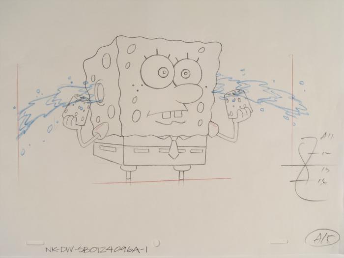 To create production cels, the original animator's drawing is transferred onto an acetate cel (by hand-inking and/or photo copying). The cel is then hand-painted on the reverse side. The cel and drawing are ready to be matted and framed. The animator's notations are at the bottom of the cel and top and bottom of the drawing. The cel is multi-layered: the water is on the first cel and SpongeBob is on the second. There is some minor paint residue on each of the second cels.