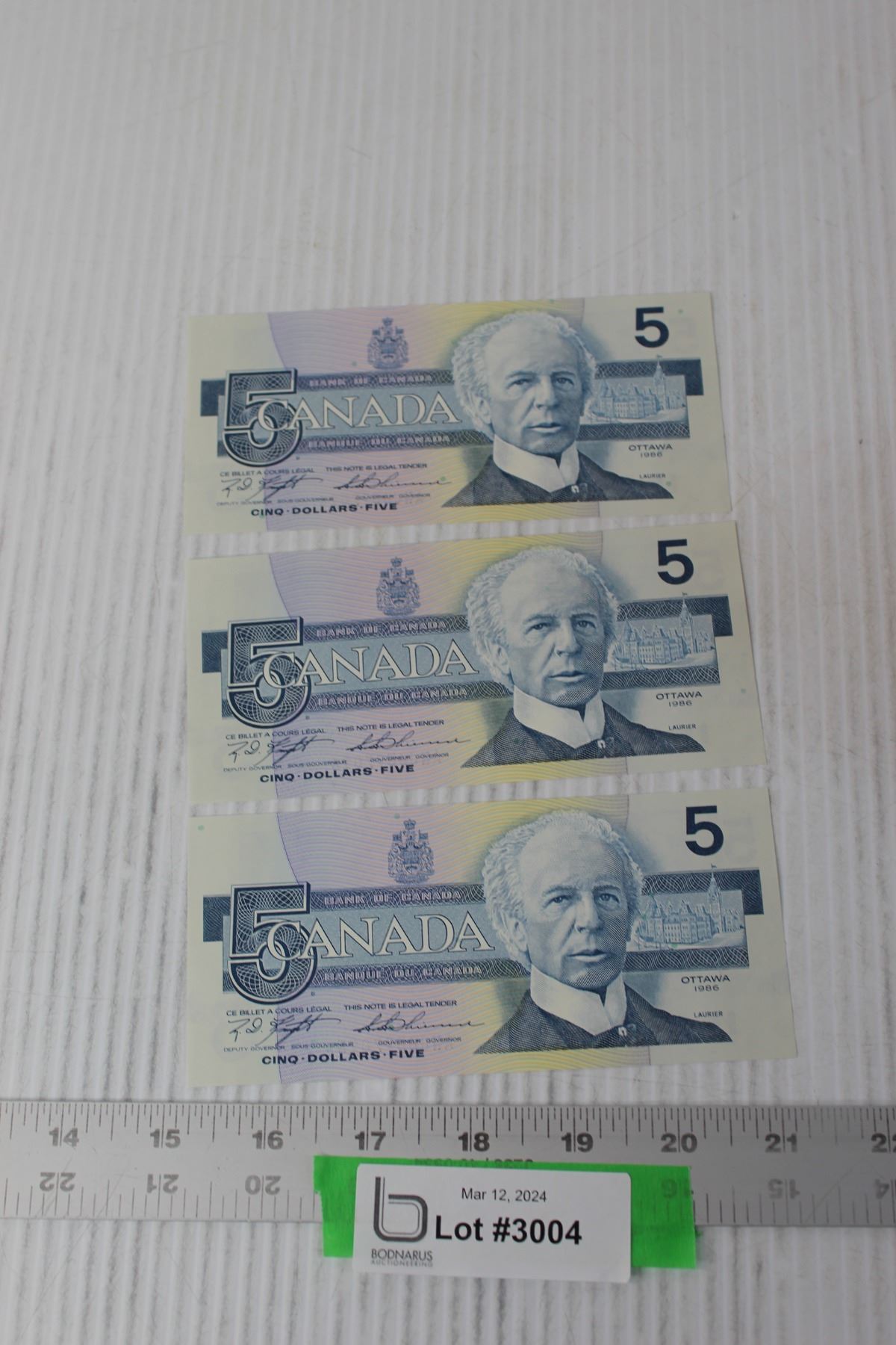 (3) Sequential Uncirculated 1986 Canadian $5 Bills