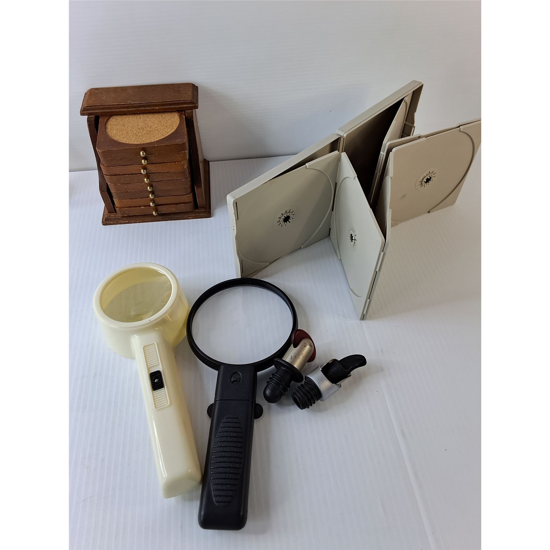 (3) Sets of Coasters- Floral Ceramic, Wooden, Harvard School of Business, (2) Magnifying Glasses, CD