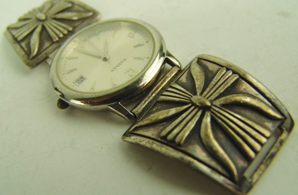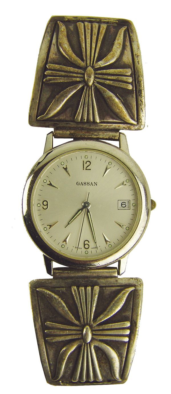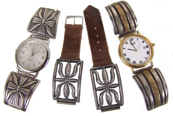 All of solid silver, two done in ketoh style (one sand cast, one overlay) by John Begay, the other marked "AB" which has a strip of 14kt gold down the middle. Very good condition.Ca. 1970s-1980sLargest 4-1/4"