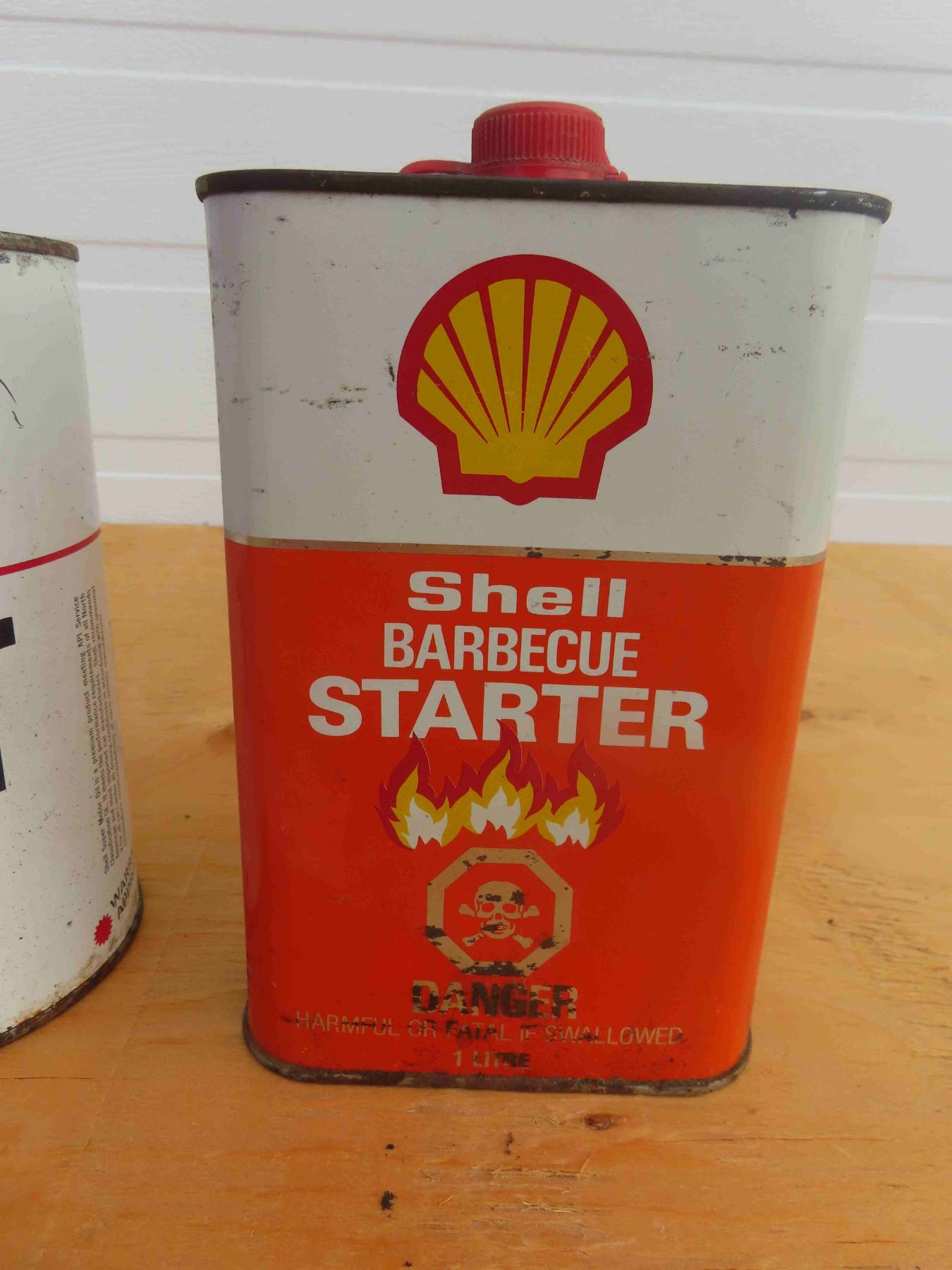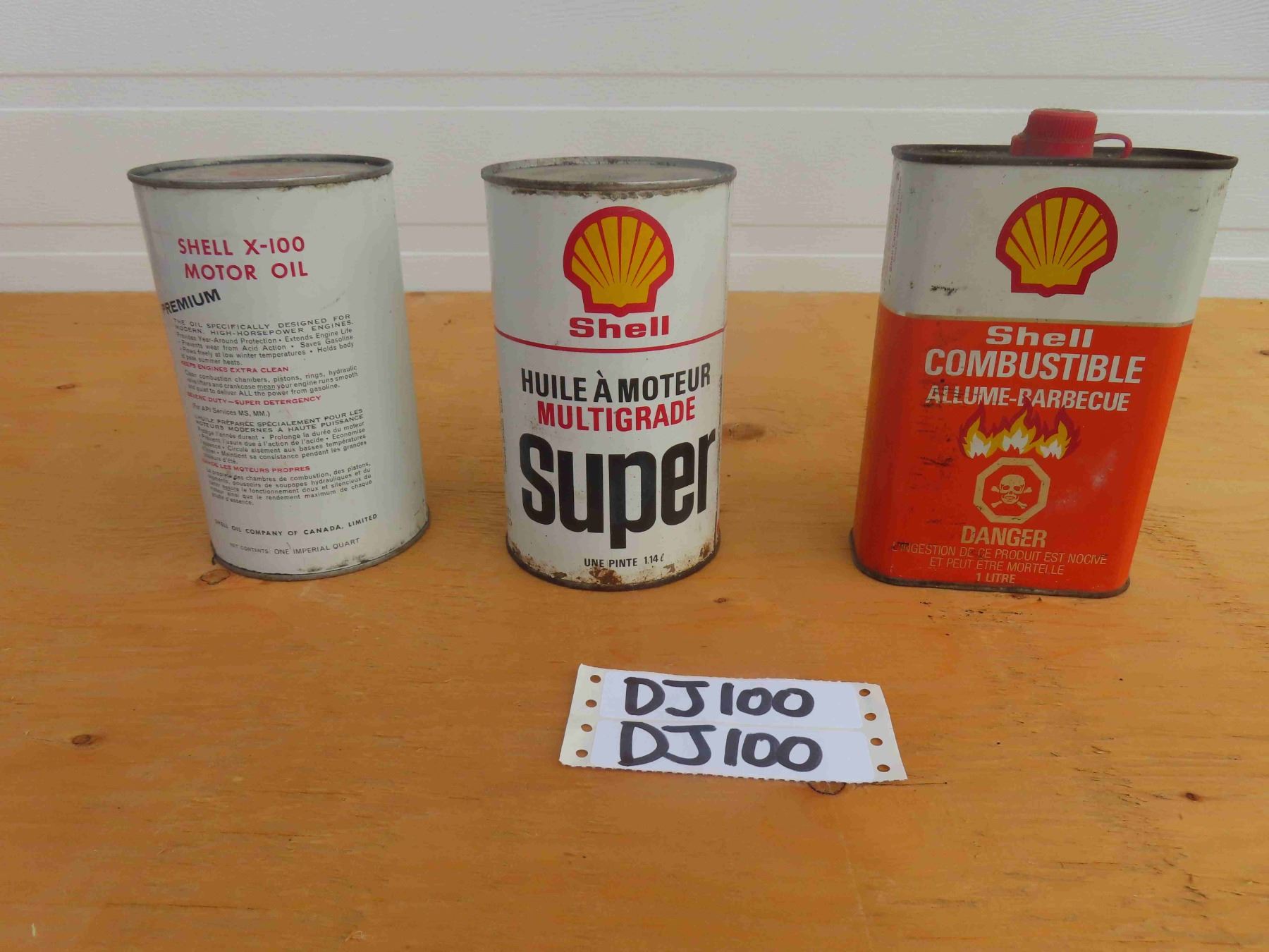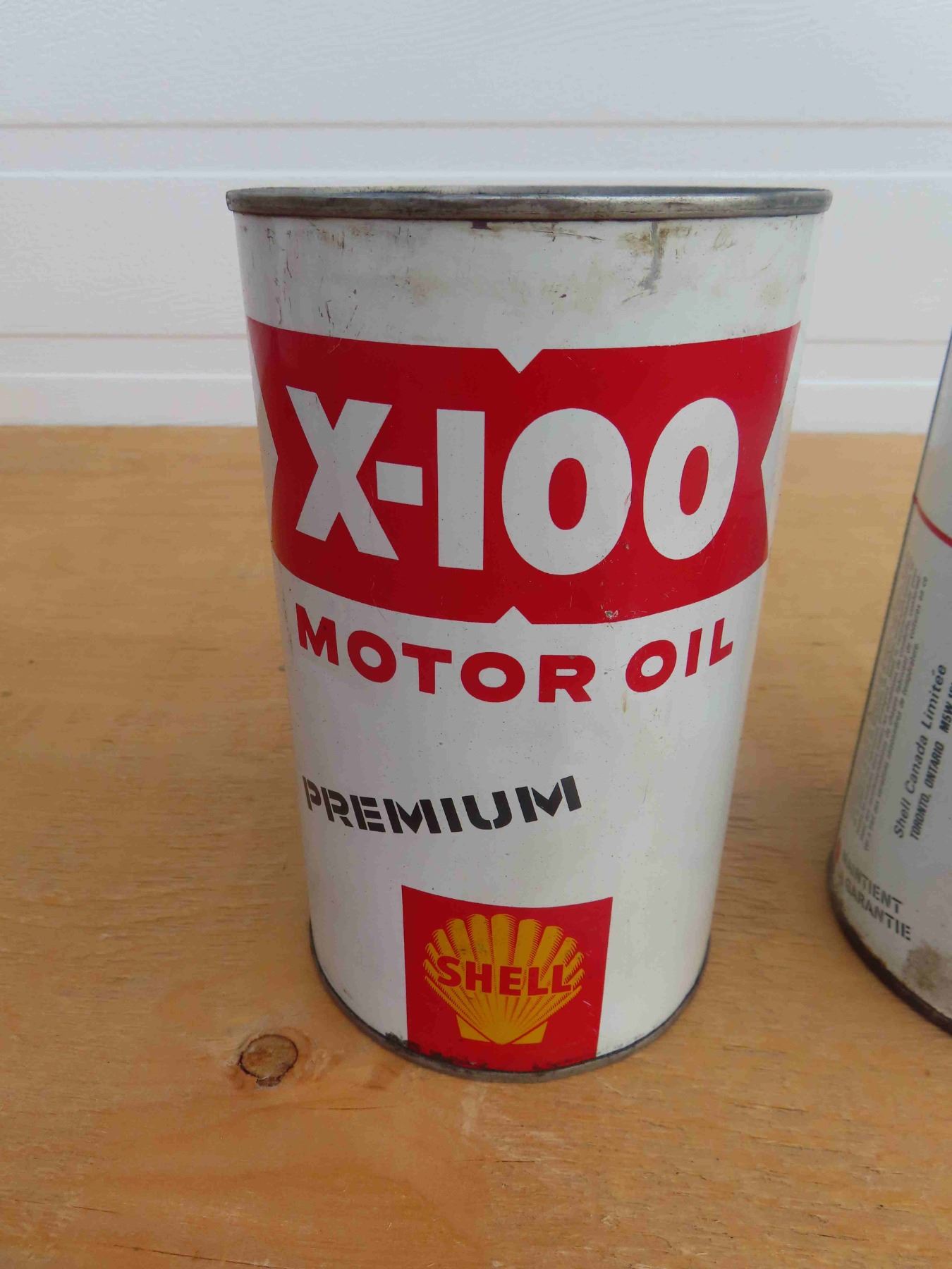 3 Shell Tins: X-100 Motor Oil 1 Quart, Super Multi Grade Quart, Bar B Q Starter Fluid 1 L