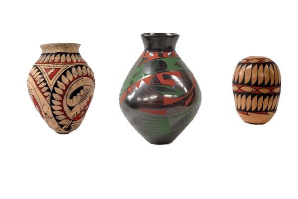 3 Signed Mexican Mata Ortiz Pottery Jars, #1 Mexican Mata Ortiz Polychrome Seed Jar by Alejandra Soto, signed by artist and measures 5.5''H x 4''D, features fish and stylized feather designs #2 Mexican Mata Ortiz Pulled Spout Jar by Anastacio Villa, signed by artist and measures 4''H x 6''D, highly burnished gun metal finish, features Paquime' inspired lines and designs #3 Mexican Mata Ortiz Polychrome Jar by Gaona, signed by artist and measures 7''H x 5.25''D, features Paquime' inspired lines and designs on marbleized clay, also features stylized feather designs