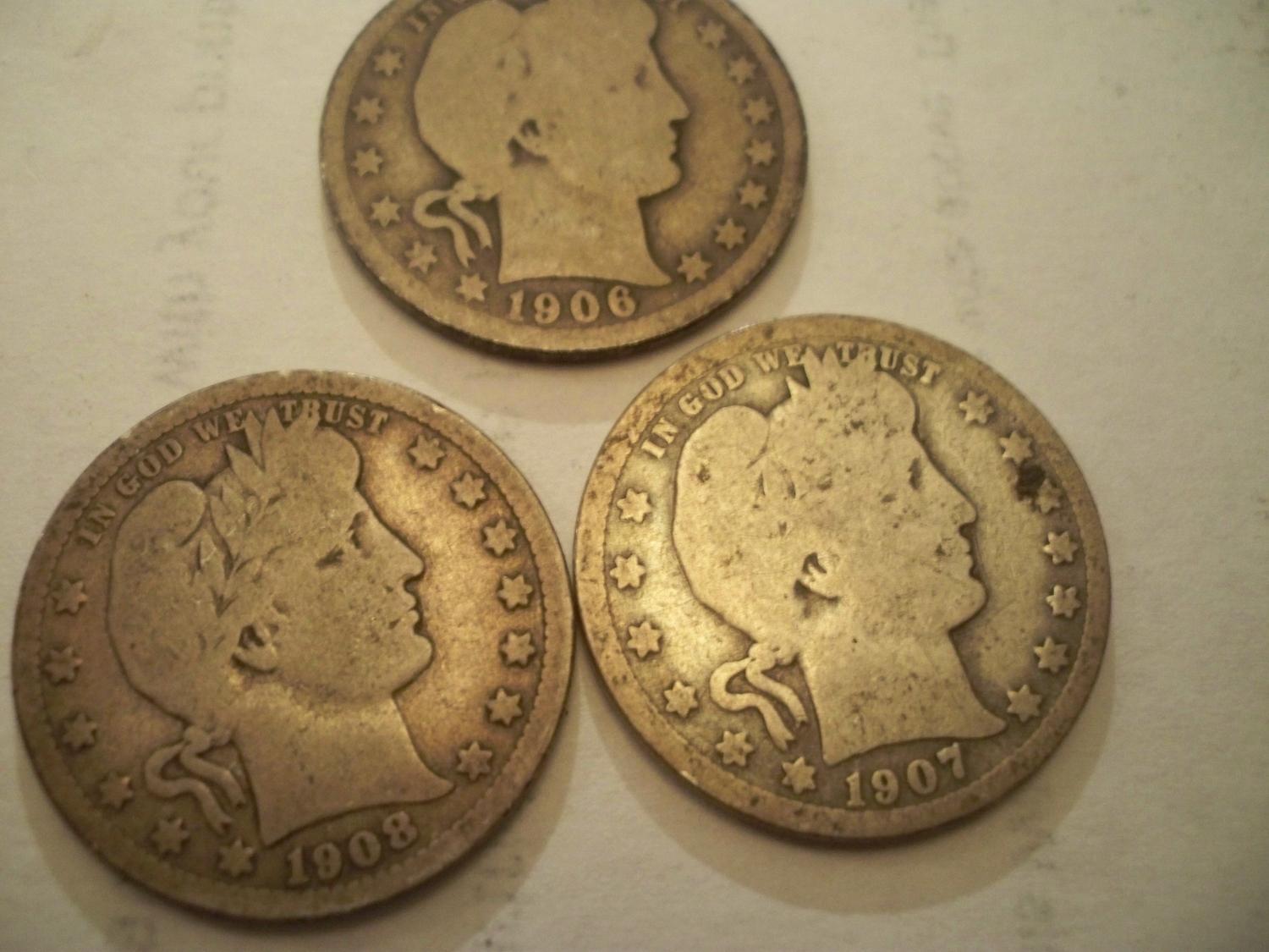 3 Silver Barber Dimes 1907, 1908-O, 1906-O